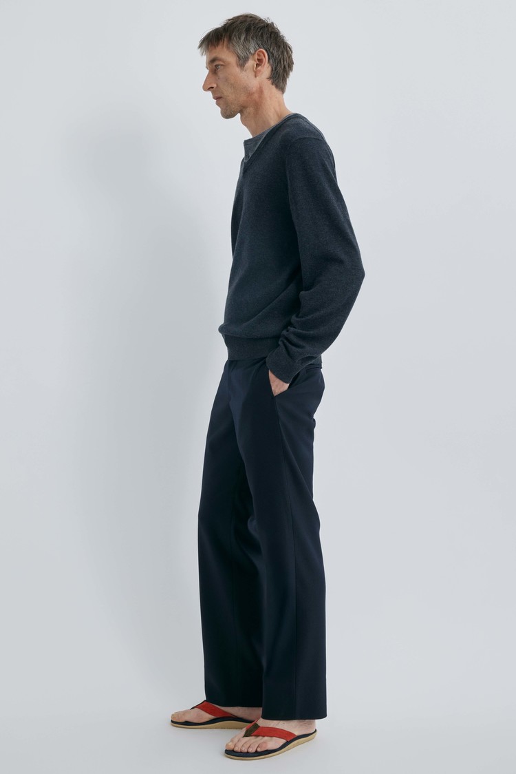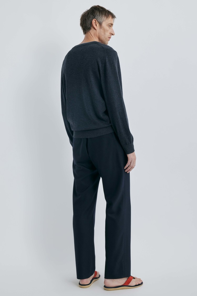 울의 포근함과 코튼의 산뜻함을 50:50 비율로 담아낸 혼방 소재입니다. 원사에 머서라이즈 가공(Mercerized)을 더해 울 특유의 거친 느낌 없이 실크처럼 매끄럽고 부드러운 터치를 구현했습니다. 은은하게 감도는 고급스러운 광택과 정제된 표면감이 특징이며, 체온을 온화하게 유지하면서도 통기성이 우수해 간절기부터 겨울까지 쾌적하게 착용할 수 있습니다. 고급 니트 봉제 방식인 사시 작업을 통해 이음새까지 정교하고 편안하게 마감했습니다.