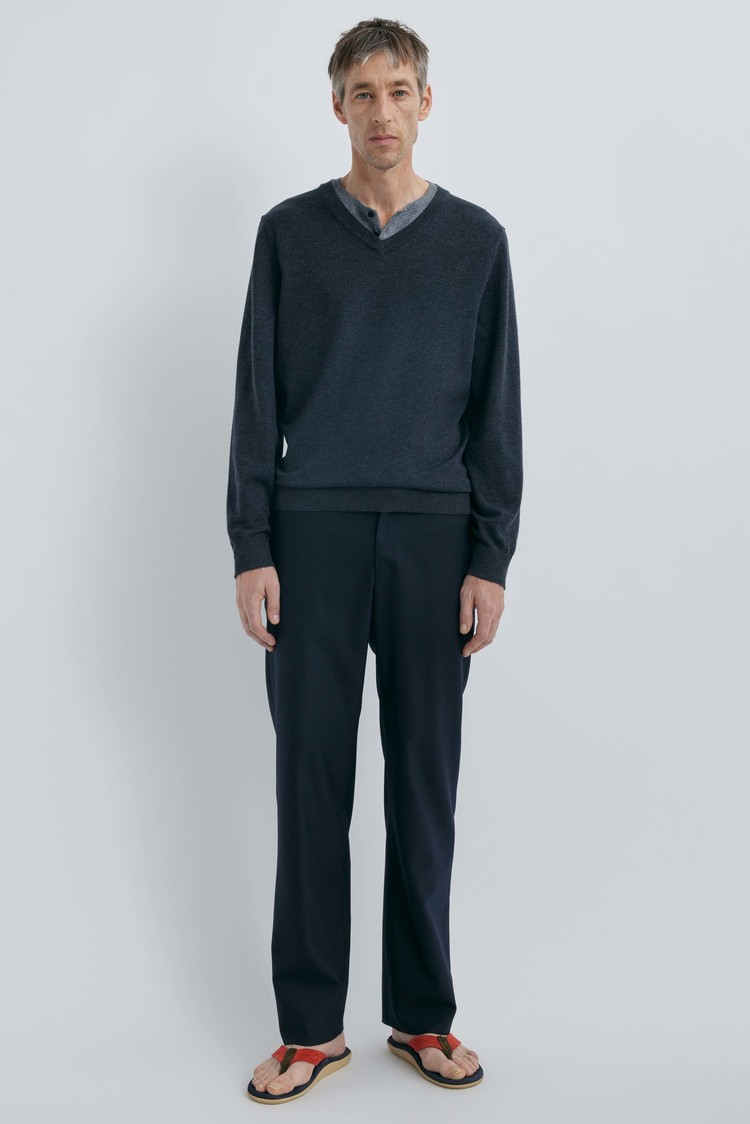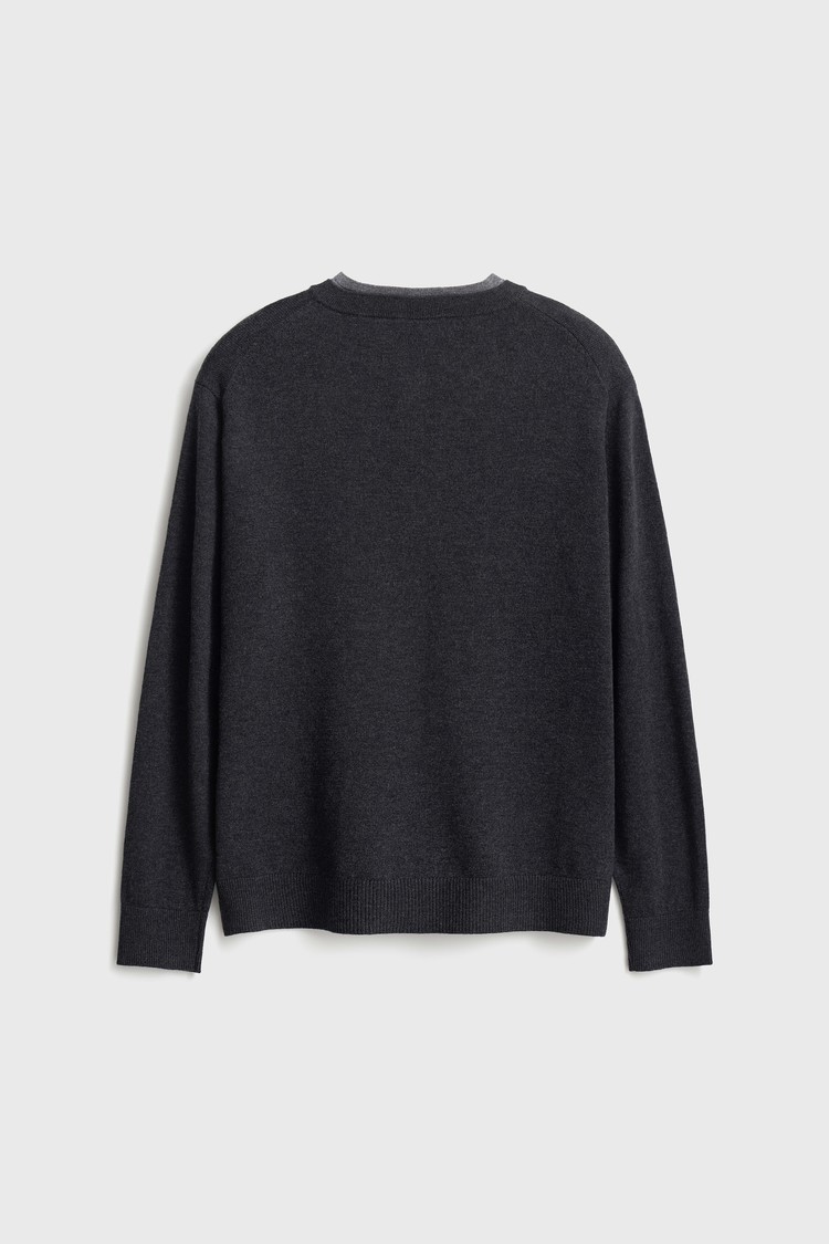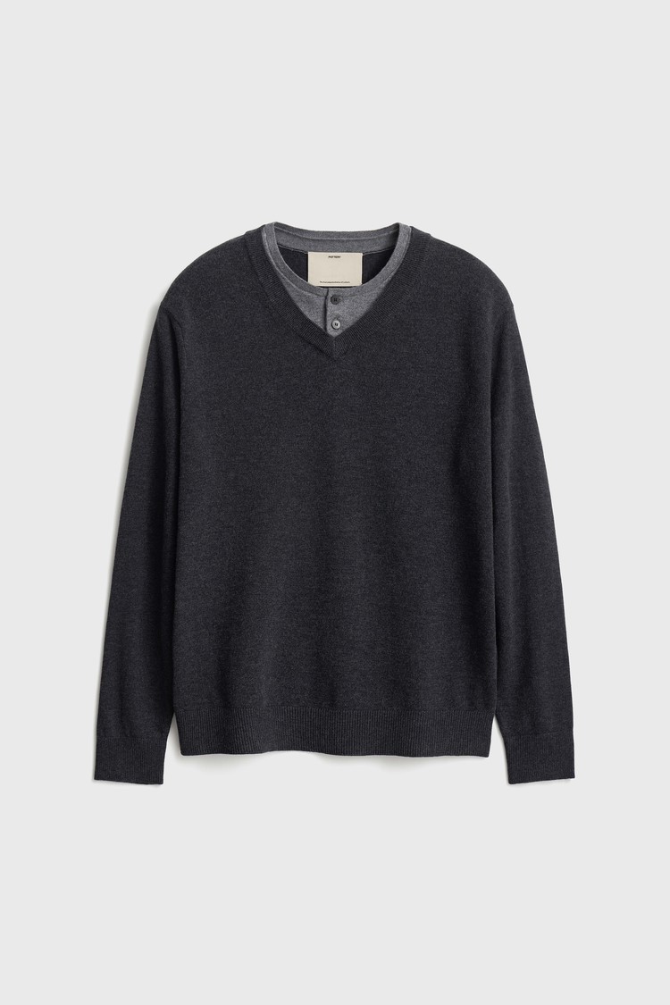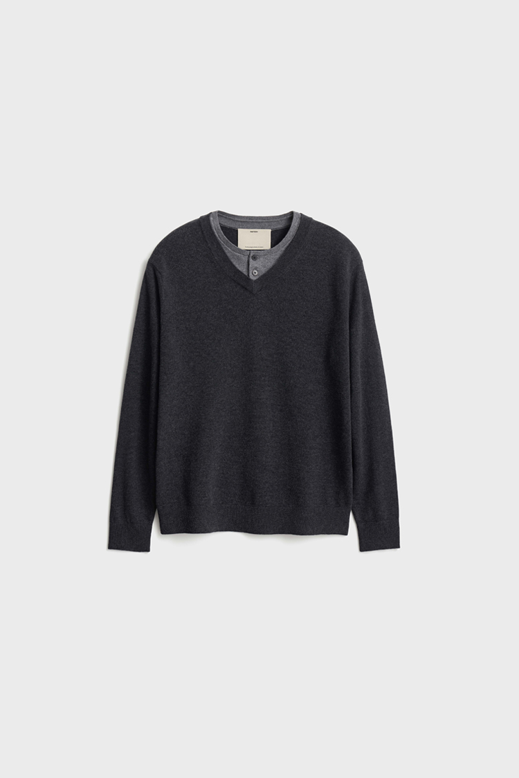 브이넥과 헨리넥이 자연스럽게 겹쳐진 독특한 더블 레이어드 구조로, 한 벌만으로도 깊이 있는 스타일링을 완성하는 니트입니다.