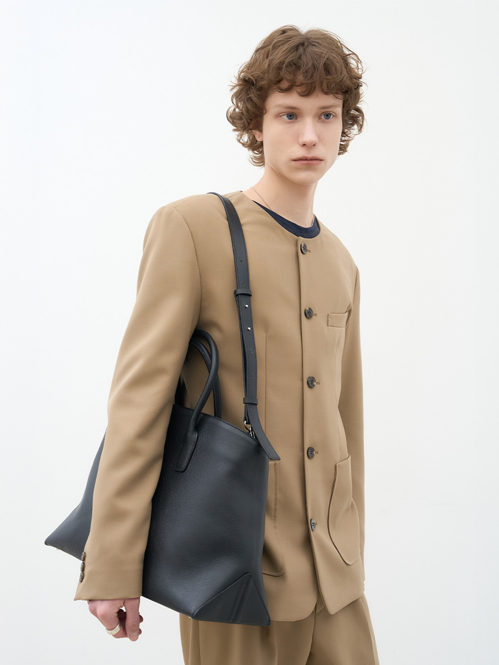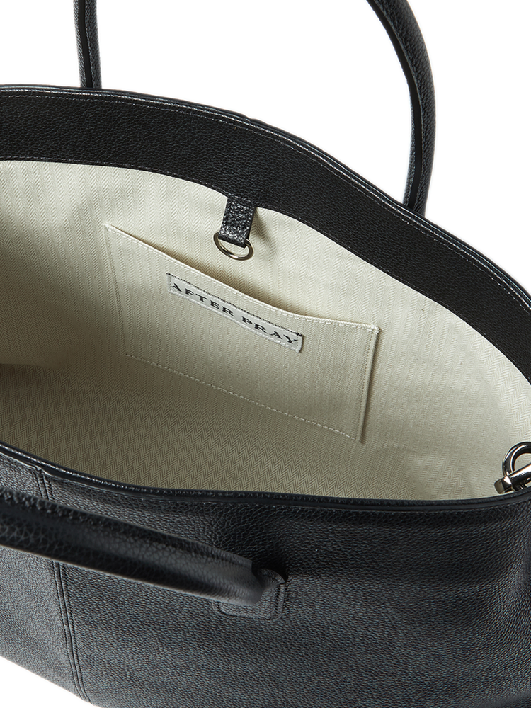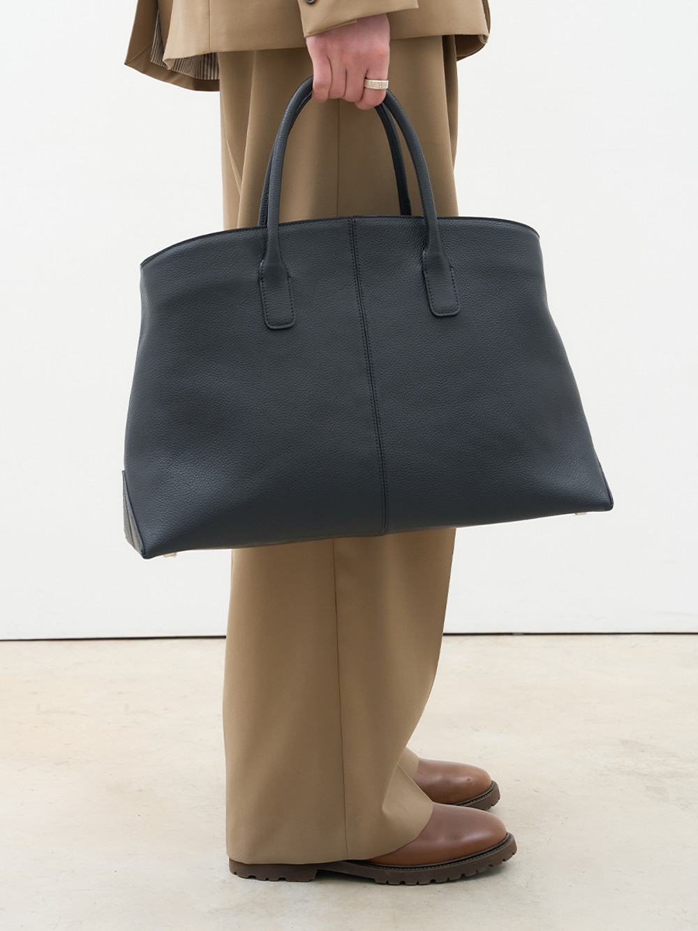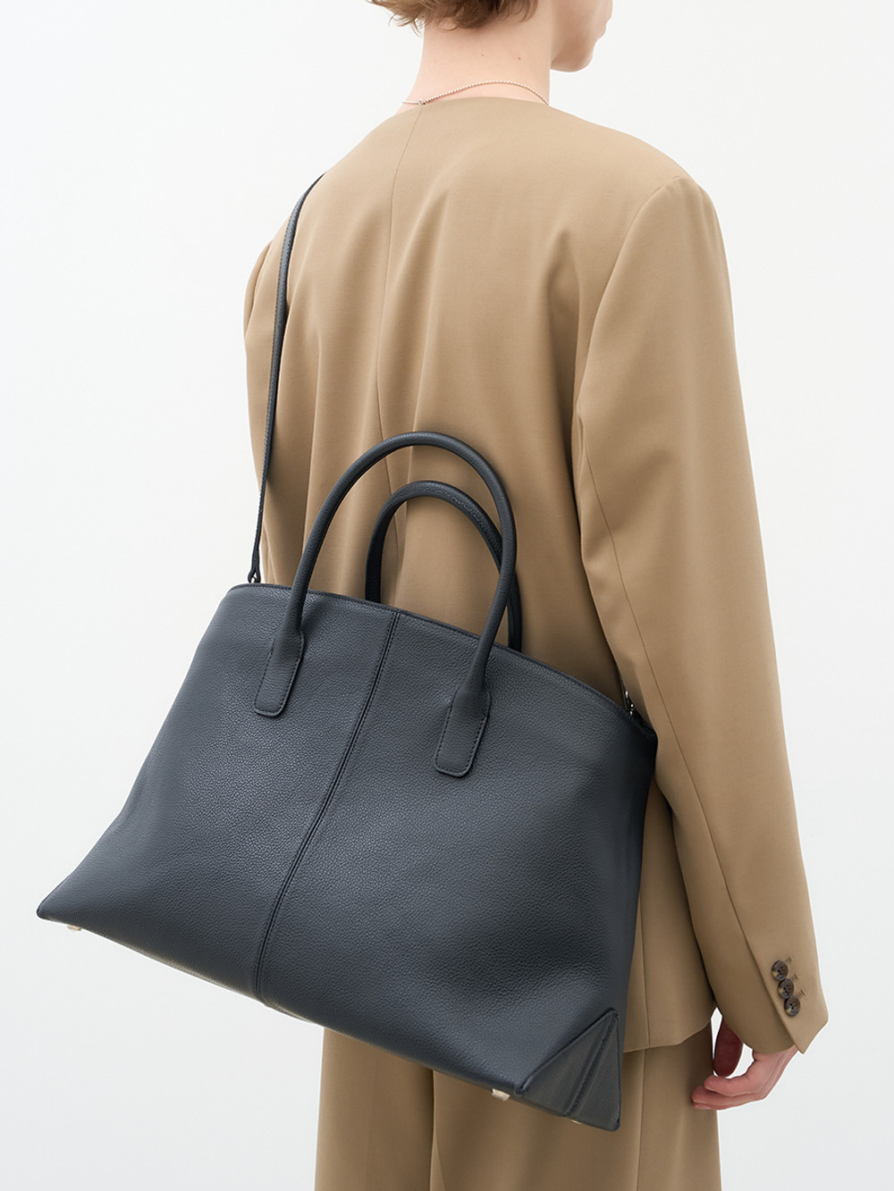 새로운 볼륨감으로 제안하는 빅 사이즈 탑 핸들 레더 백. 이탈리아 풀그레인 오플 카우 레더 고유의 밀도 높은 조직감과 깊이 있는 텍스처를 투영한 외관. 삼각 패턴 설계의 메커니즘을 적용하여 안정적인 균형을 유지하는 구조적인 바닥 디자인. 가방 내부를 헤링본 조직의 코튼 안감으로 직조하여 보이지 않는 곳까지 정밀하게 마감한 공정. 핸드 스트랩과 탈부착 가능한 크로스 스트랩의 구성으로 사용자의 라이프스타일에 맞춘 유연한 형태 변화. 넉넉한 수납 용량과 건축적인 실루엣이 조화를 이루어 룩의 완성도를 높이는 감각적인 디자인으로 완성된 매력적인 아이템.