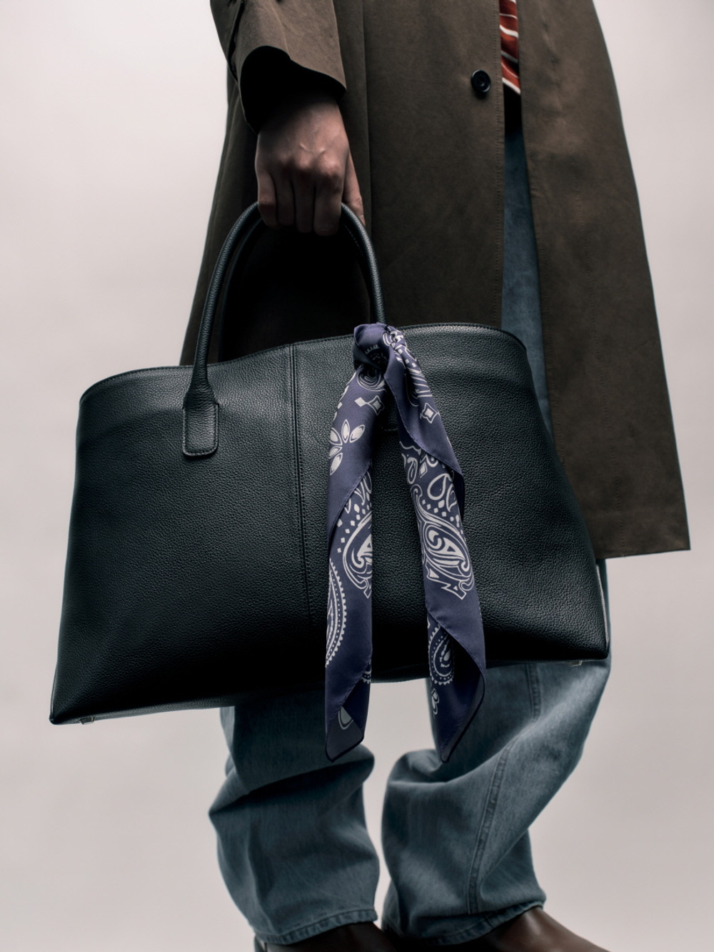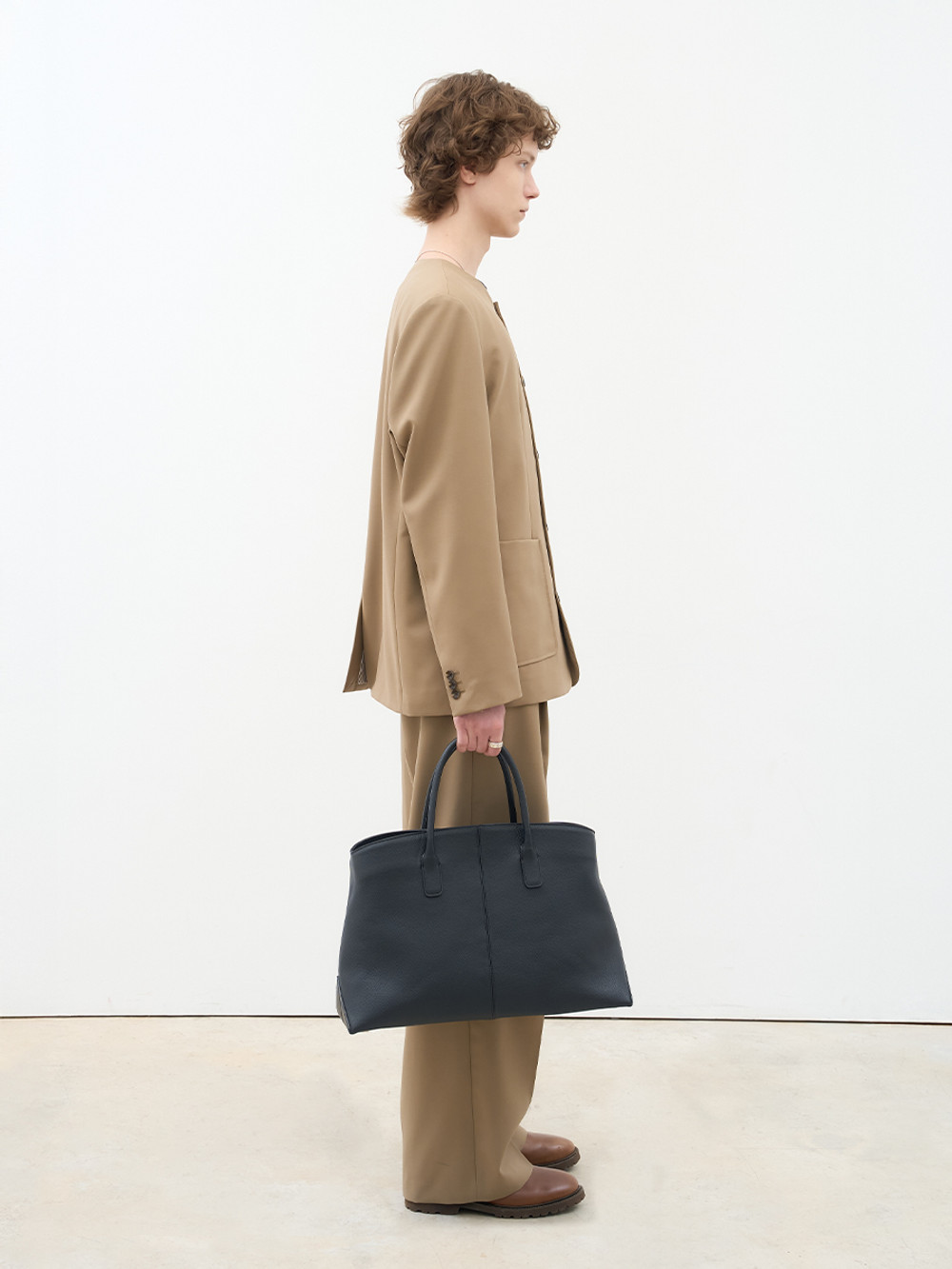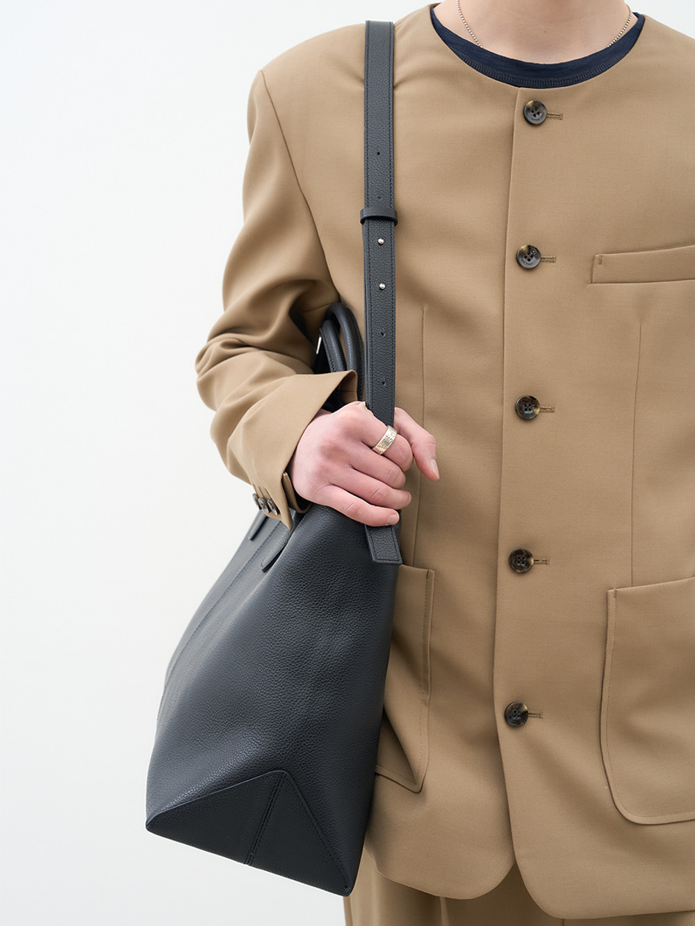 새로운 볼륨감으로 제안하는 빅 사이즈 탑 핸들 레더 백. 이탈리아 풀그레인 오플 카우 레더 고유의 밀도 높은 조직감과 깊이 있는 텍스처를 투영한 외관. 삼각 패턴 설계의 메커니즘을 적용하여 안정적인 균형을 유지하는 구조적인 바닥 디자인. 가방 내부를 헤링본 조직의 코튼 안감으로 직조하여 보이지 않는 곳까지 정밀하게 마감한 공정. 핸드 스트랩과 탈부착 가능한 크로스 스트랩의 구성으로 사용자의 라이프스타일에 맞춘 유연한 형태 변화. 넉넉한 수납 용량과 건축적인 실루엣이 조화를 이루어 룩의 완성도를 높이는 감각적인 디자인으로 완성된 매력적인 아이템.