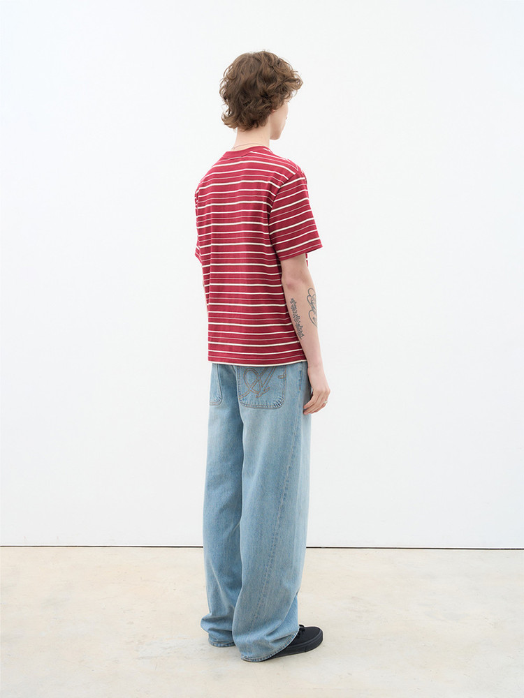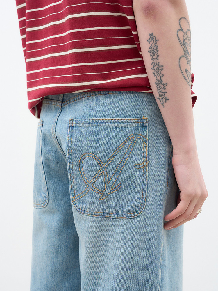 새롭게 선보이는 트위스트 데님 진스. ARTISTIC MILL(ADM)사에서 정교하게 재직한 12.5oz 프리미엄 데님을 채택하여 구현한 탄탄한 밀도와 깊이 있는 텍스처의 정수. 머서라이즈(Mercerization) 공정을 거쳐 불순물을 정제하고 완성한 투명하고 맑은 텍스처. 인심과 아웃심이 유연하게 회전하는 트위스트 절개 라인을 따라 흐르는 입체적이고 전위적인 실루엣. 정교한 스톤 워싱으로 구현한 깊이 있는 볼륨과 데님 본연의 자연스러운 페이스. 뒷 포켓에 섬세하게 새긴 AP 심볼 스티치 디테일로 완성한 브랜드의 독보적인 아이덴티티. 균형 잡힌 와이드 핏과 견고한 소재감이 조화를 이룬 현대적 감각의 마스터피스.
