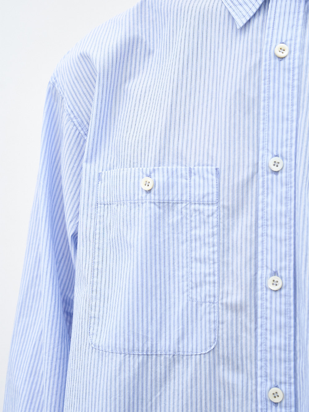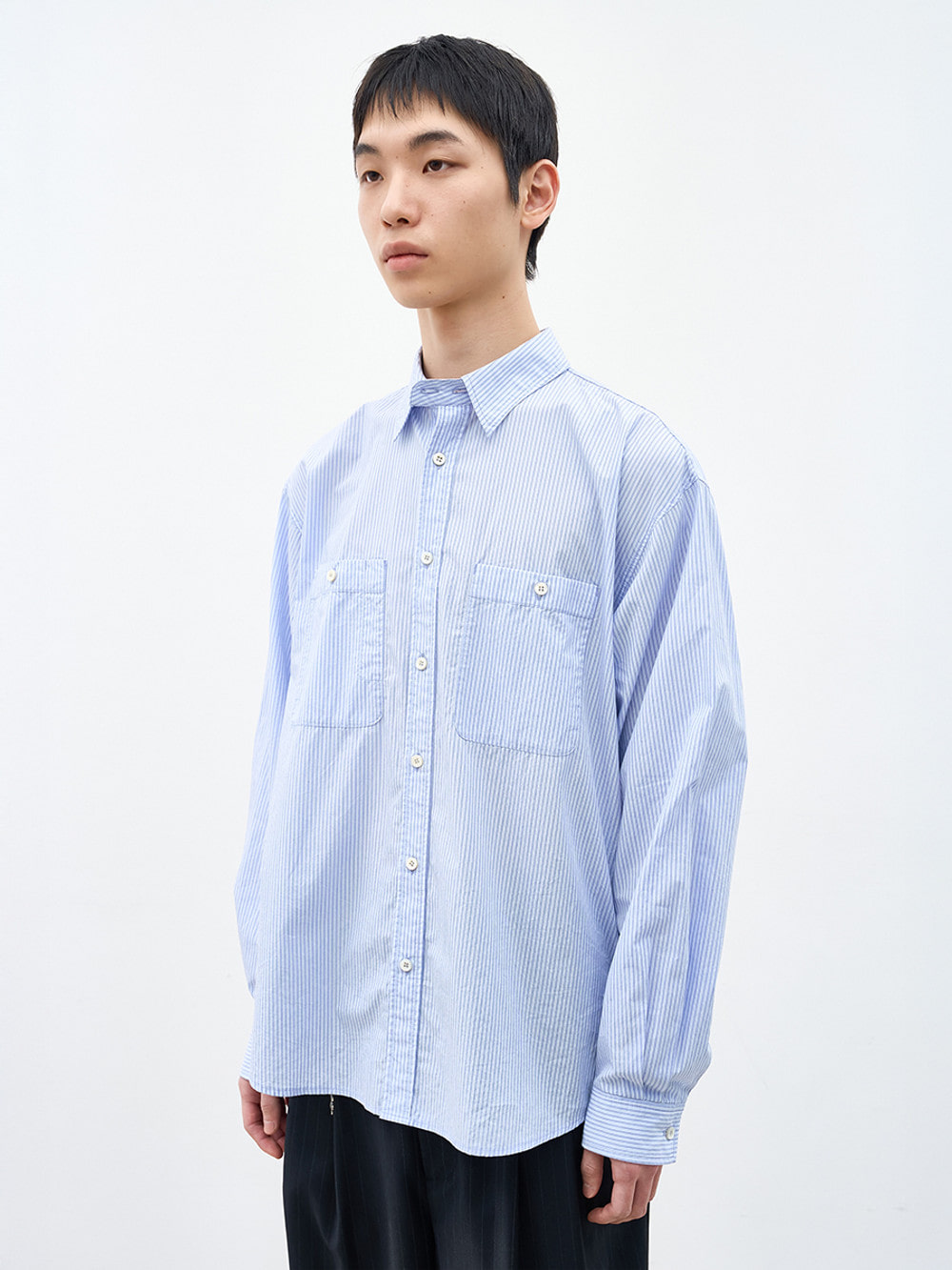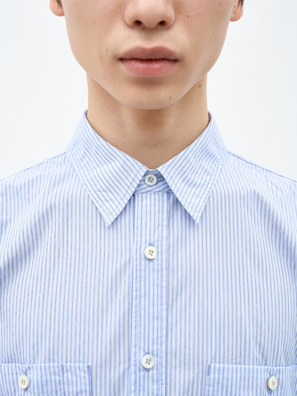 워크웨어 무드를 현대적인 미학으로 재해석한 투 포켓 셔츠. 실용적인 펜꽂이 디테일과 카라 밴드가 넘어오는 독창적인 구조의 디테일이 특징. 톤온톤 배색 스티치를 적용하여 워크웨어 특유의 기능적 디테일에 세련된 위트를 가미한 설계. 담백한 스트라이프 패턴의 코튼 소재 위로 노멀 워싱 가공을 더해 구현한 캐주얼한 감각과 은은한 퍼커링의 텍스처. 세미 오버핏 실루엣과 최적의 두께감으로 사계절 내내 다채로운 스타일링을 제안하는 높은 활용도의 피스.