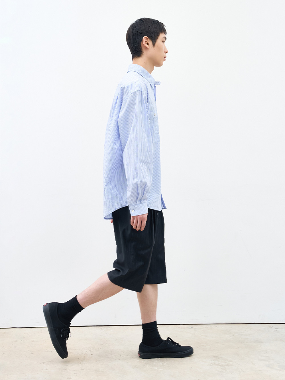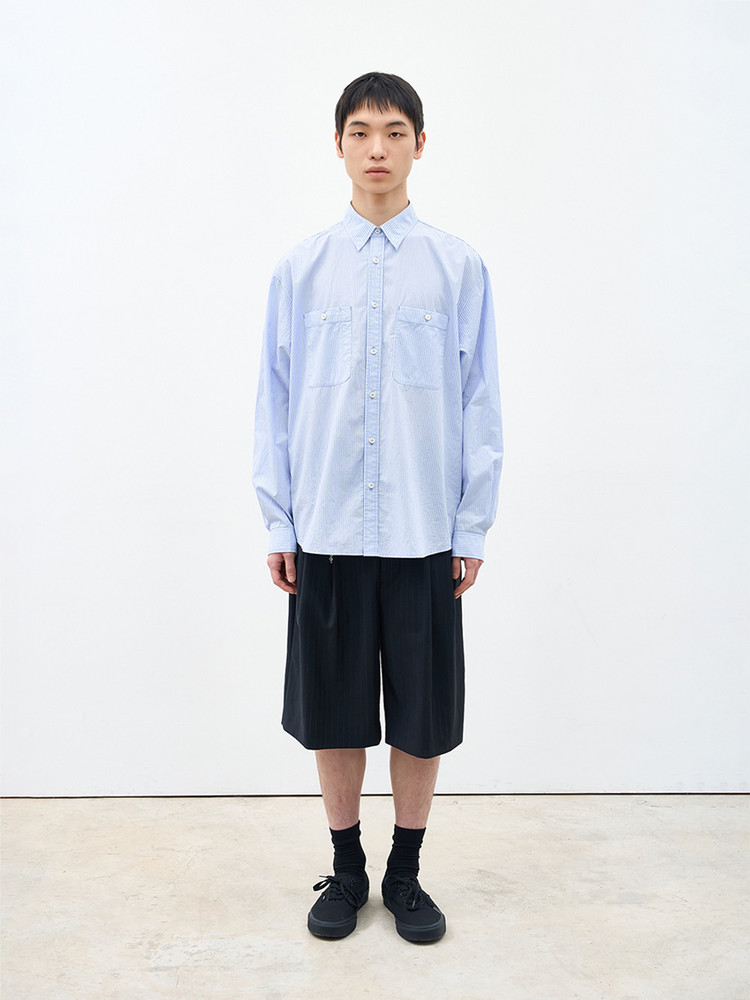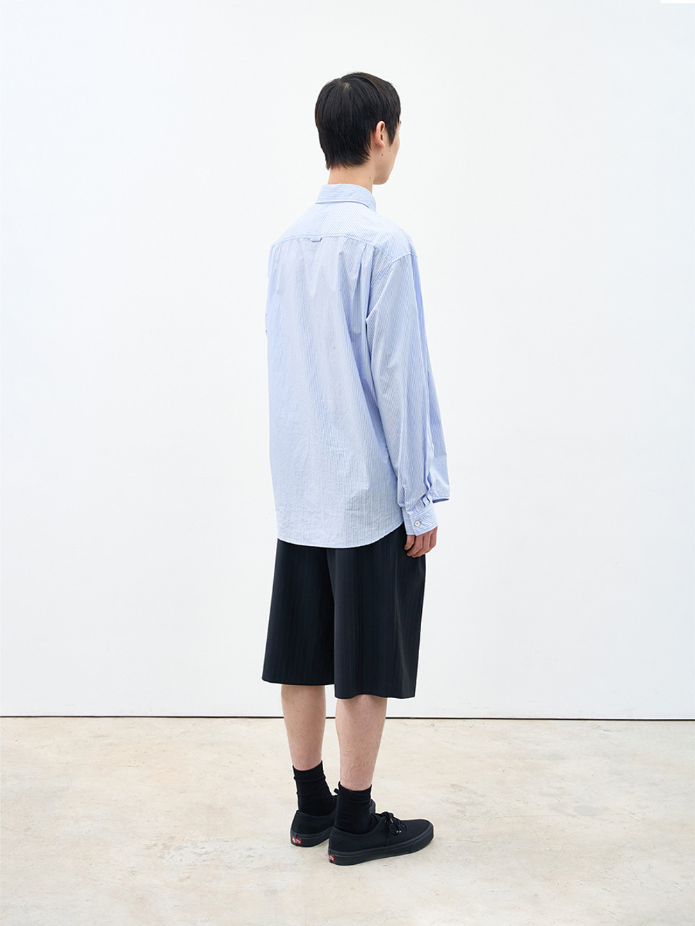 워크웨어 무드를 현대적인 미학으로 재해석한 투 포켓 셔츠. 실용적인 펜꽂이 디테일과 카라 밴드가 넘어오는 독창적인 구조의 디테일이 특징. 톤온톤 배색 스티치를 적용하여 워크웨어 특유의 기능적 디테일에 세련된 위트를 가미한 설계. 담백한 스트라이프 패턴의 코튼 소재 위로 노멀 워싱 가공을 더해 구현한 캐주얼한 감각과 은은한 퍼커링의 텍스처. 세미 오버핏 실루엣과 최적의 두께감으로 사계절 내내 다채로운 스타일링을 제안하는 높은 활용도의 피스.