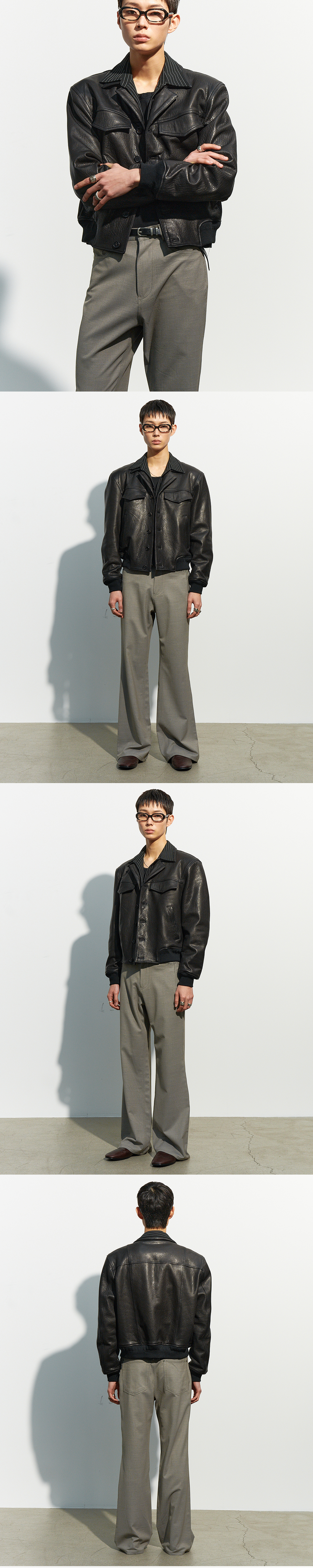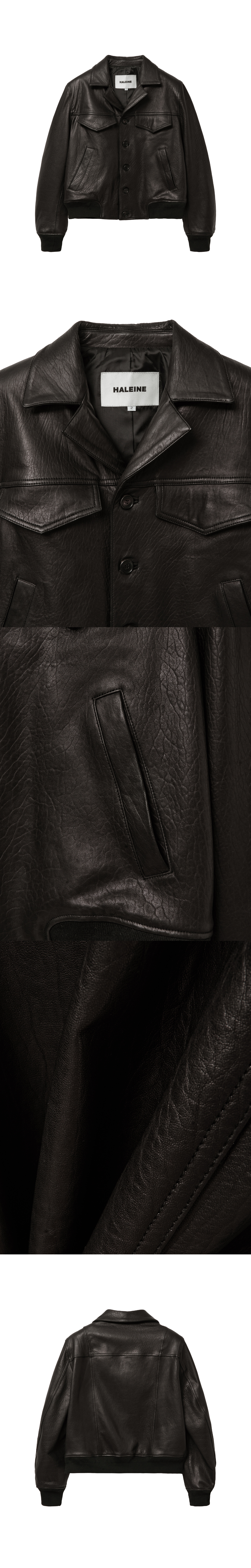 텍스처가 살아있는 페이크 레더 소재로 제작된 오픈 칼라 블루종입니다.