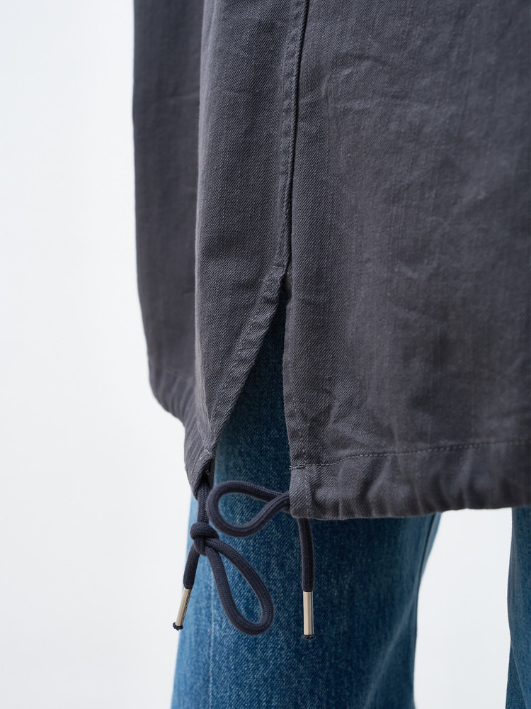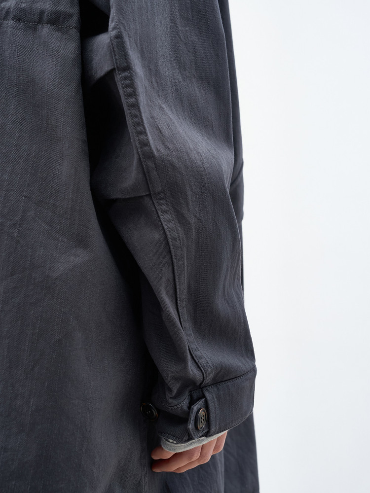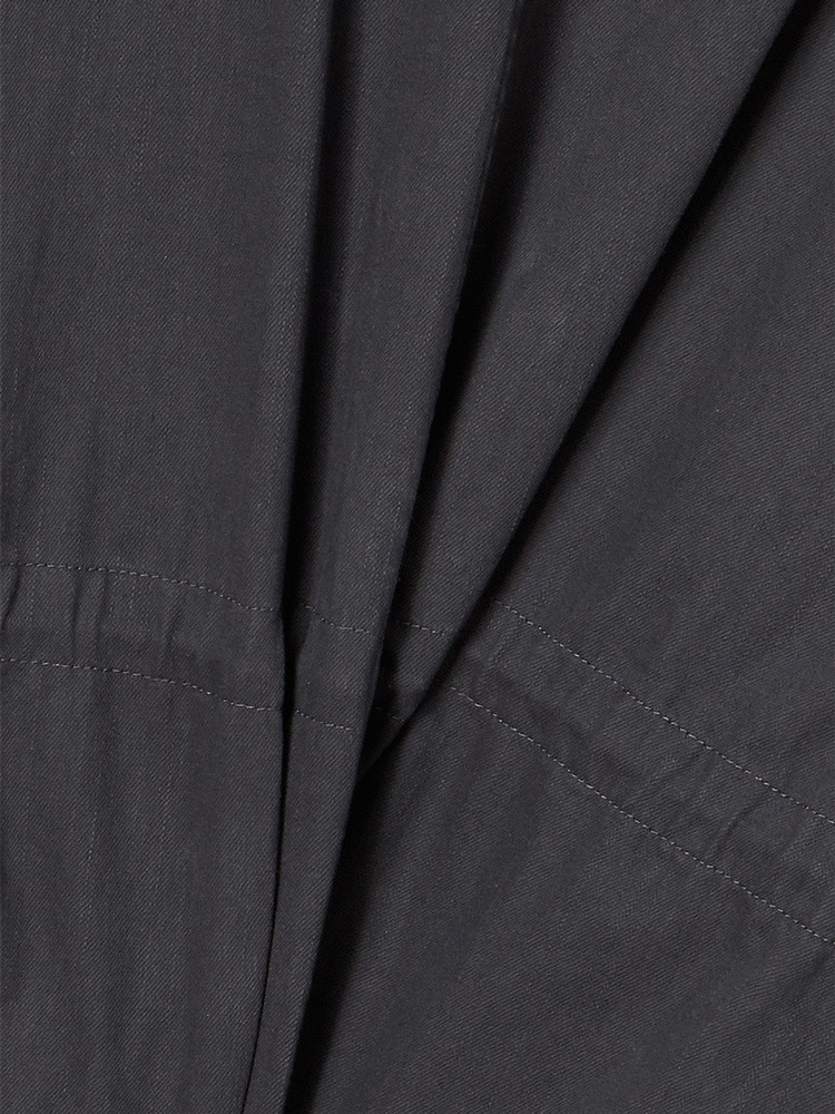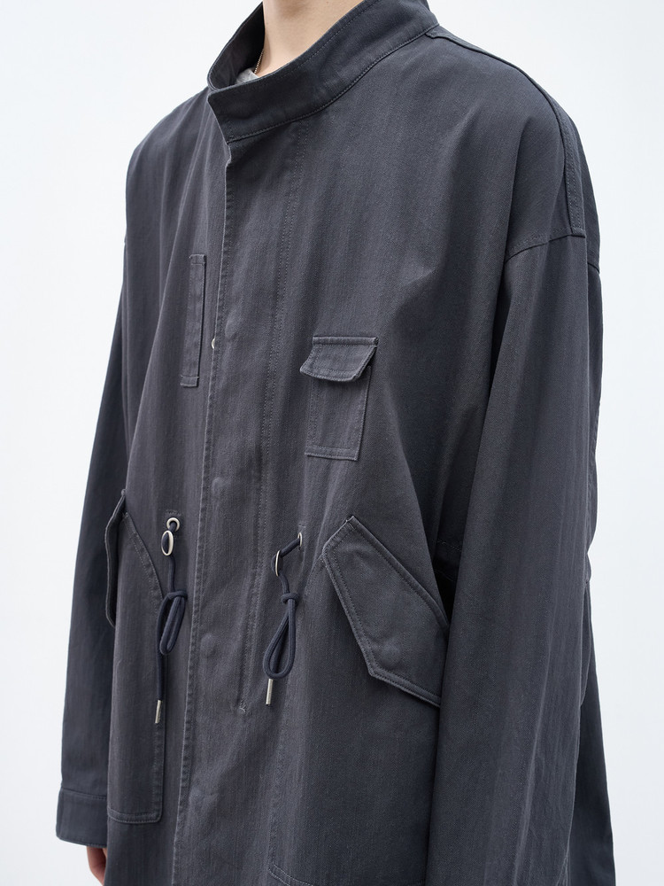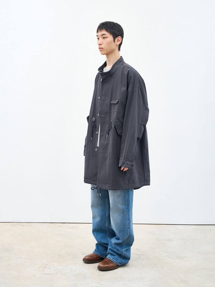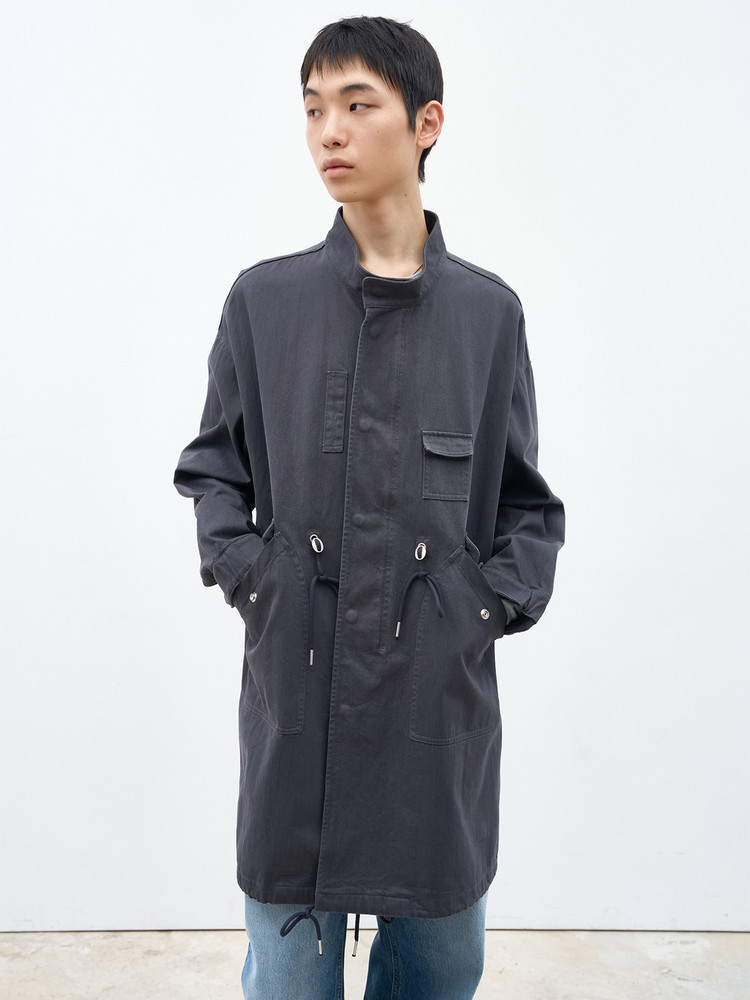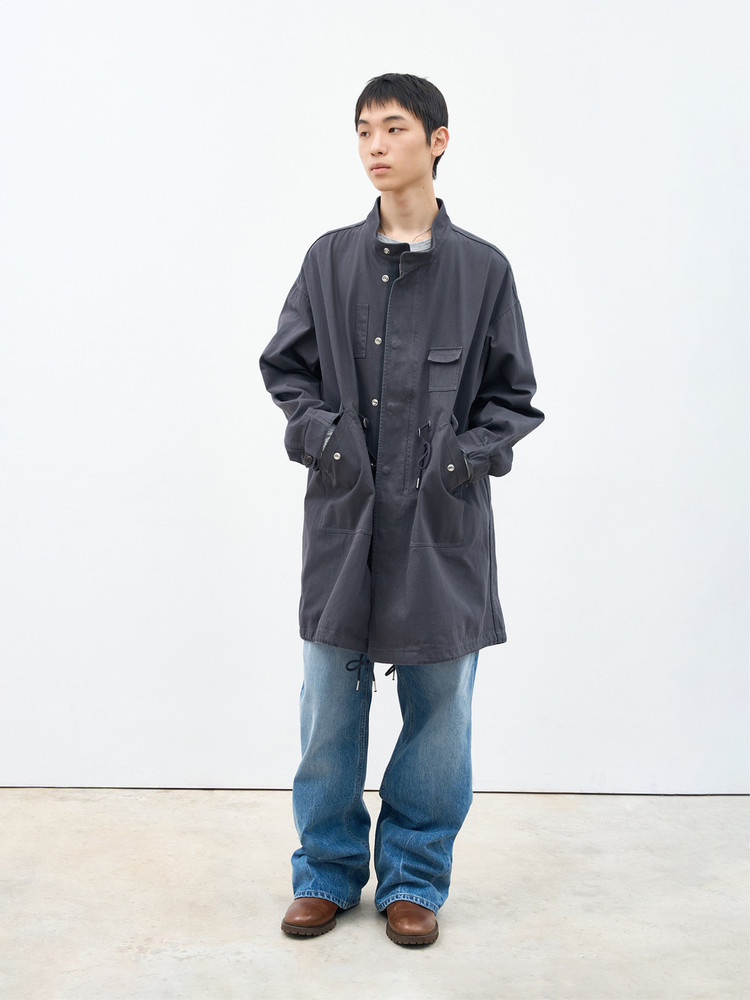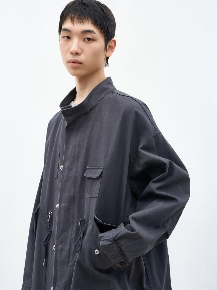 위트 있는 포켓 디테일로 새로운 분위기를 선사하는 피쉬테일 코트. 은은한 요철감과 빗줄기가 흐르는 듯한 독특한 텍스처가 살아 있는 16수 슬럽 트윌 코튼 소재. 곡선으로 정교하게 마감된 아웃 포켓과 미니 포켓의 조화로 실용성과 위트를 동시에 강조한 디자인. 밀리터리의 본질적인 아카이브를 현대적인 감성으로 재해석한 감각적인 아우터.