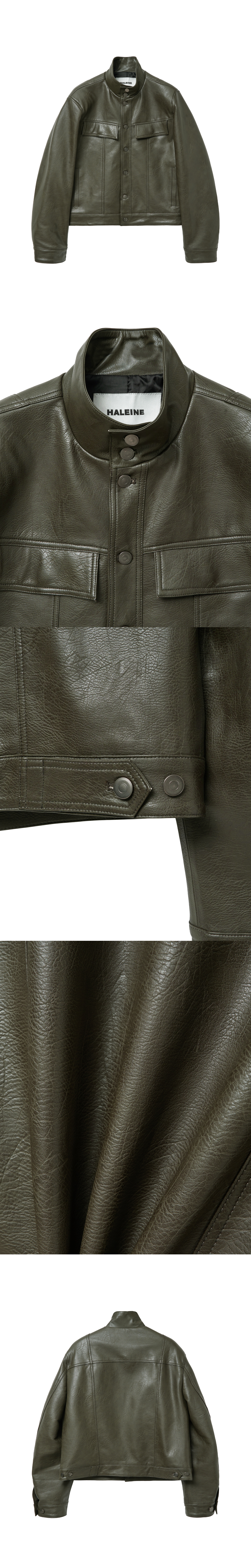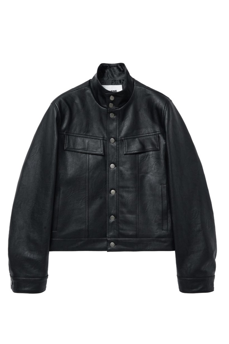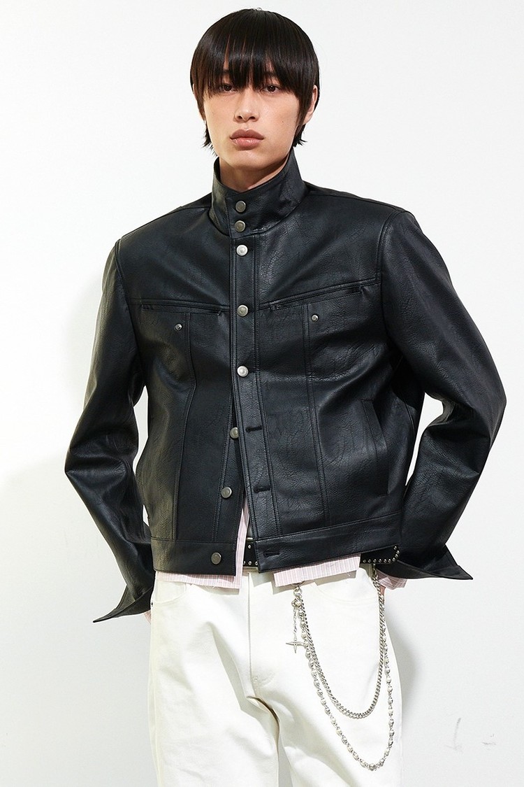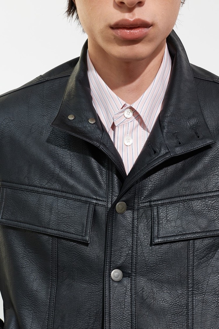 - 페이크 레더 소재로 제작된 하이넥 트러커 재킷입니다.
