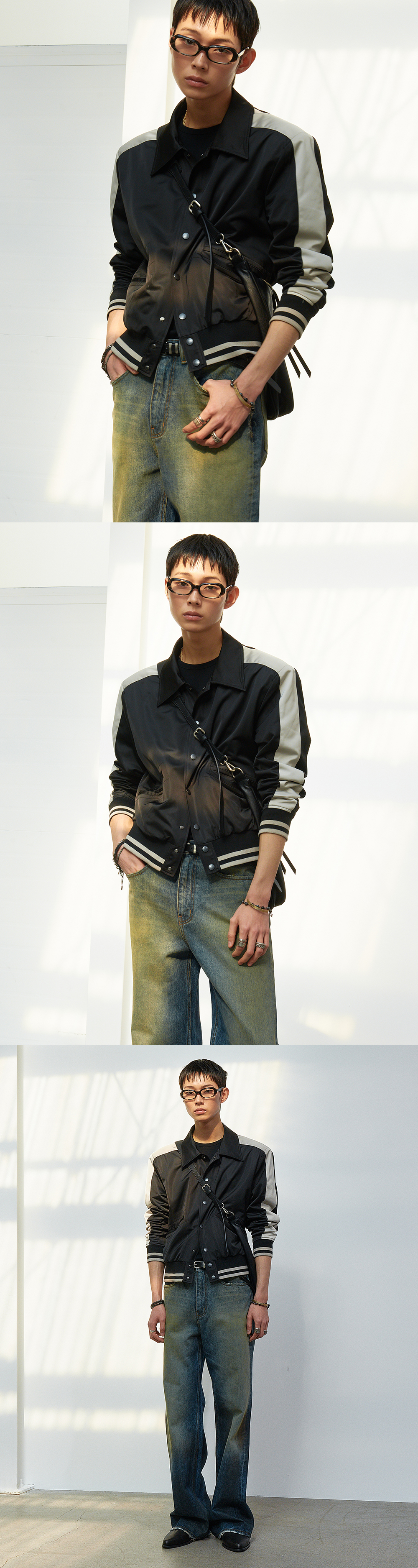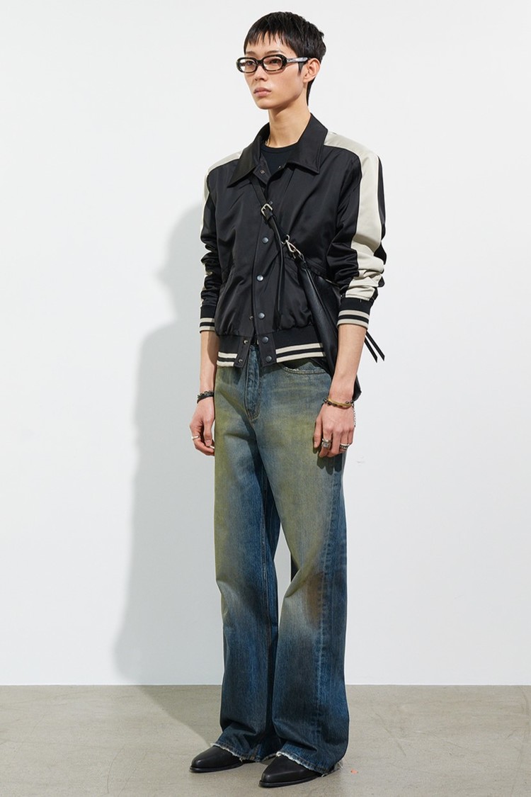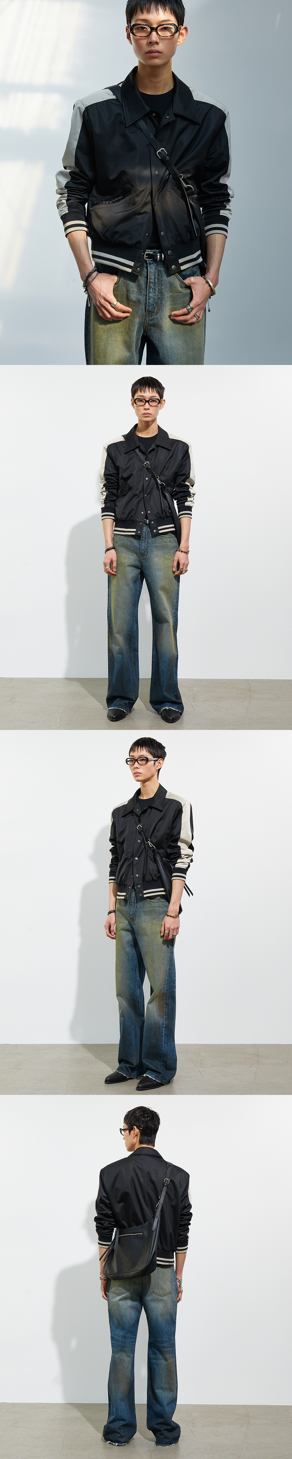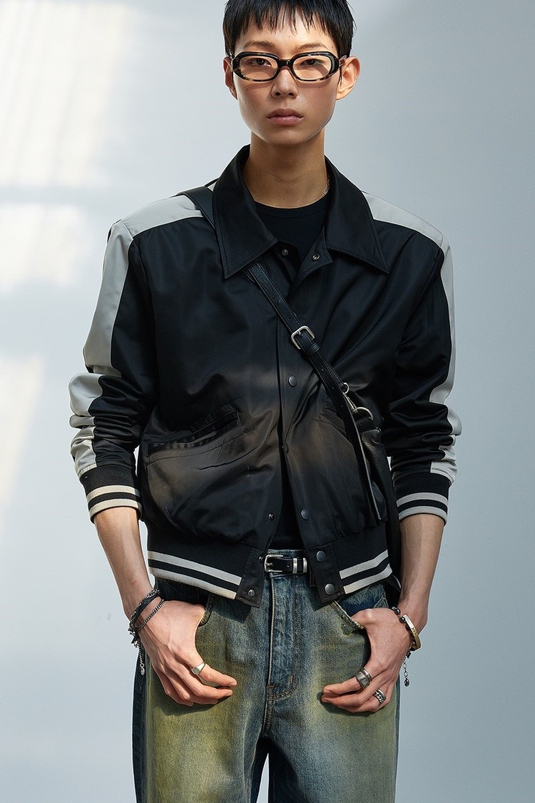 - 새틴 소재를 사용해 제작한 바시티 패널 자켓입니다.