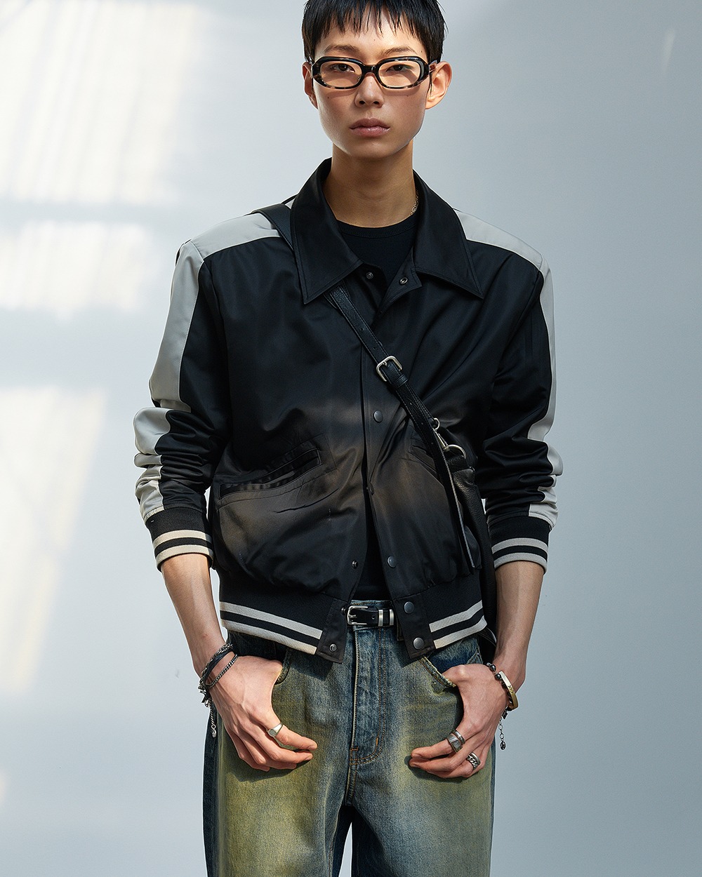 스프레드 칼라를 적용해 바시티 자켓에 절제된 구조감을 더했습니다.