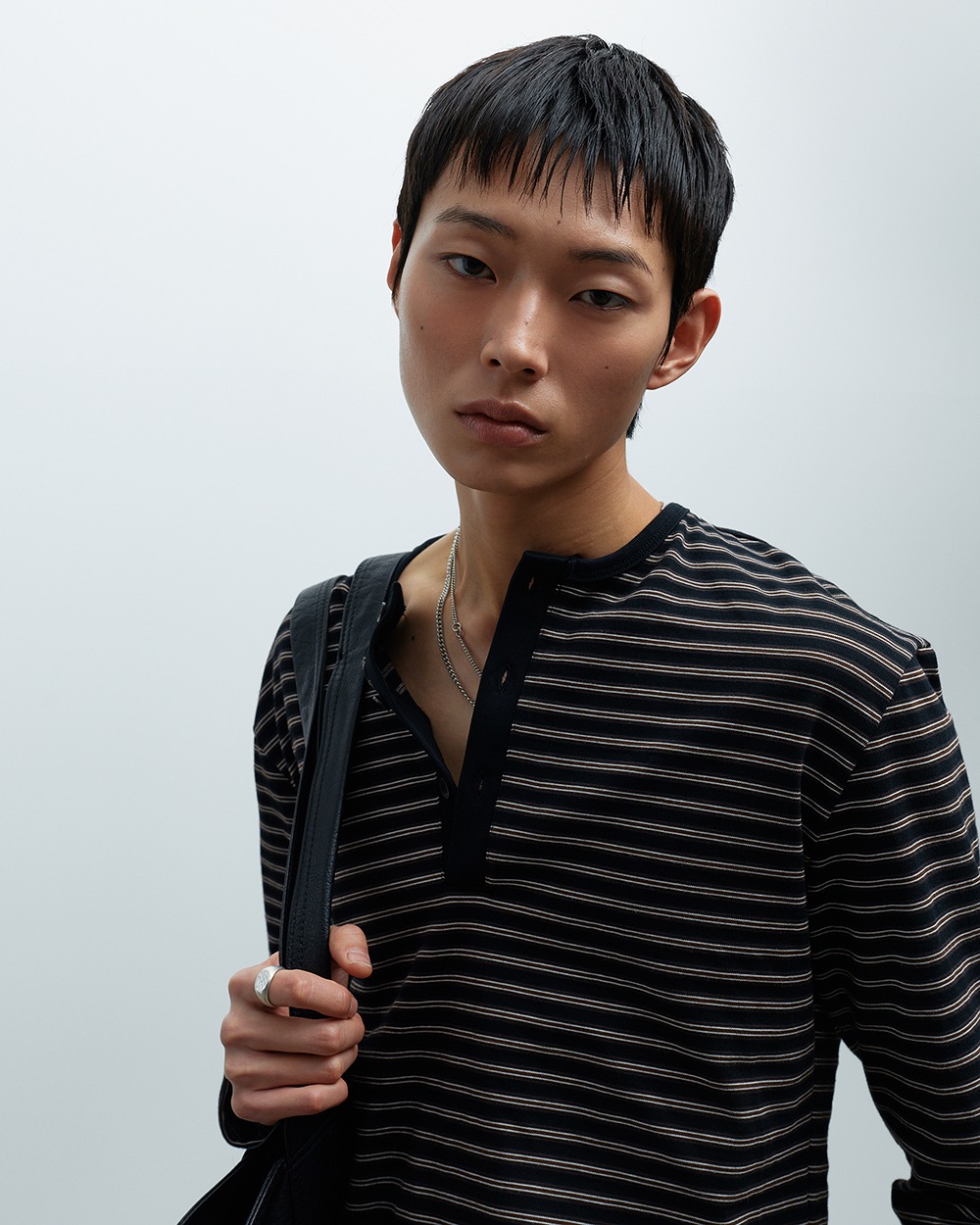 가볍고 부드러운 터치감의 스트라이프 원단으로 제작된 헨리넥 티셔츠입니다.