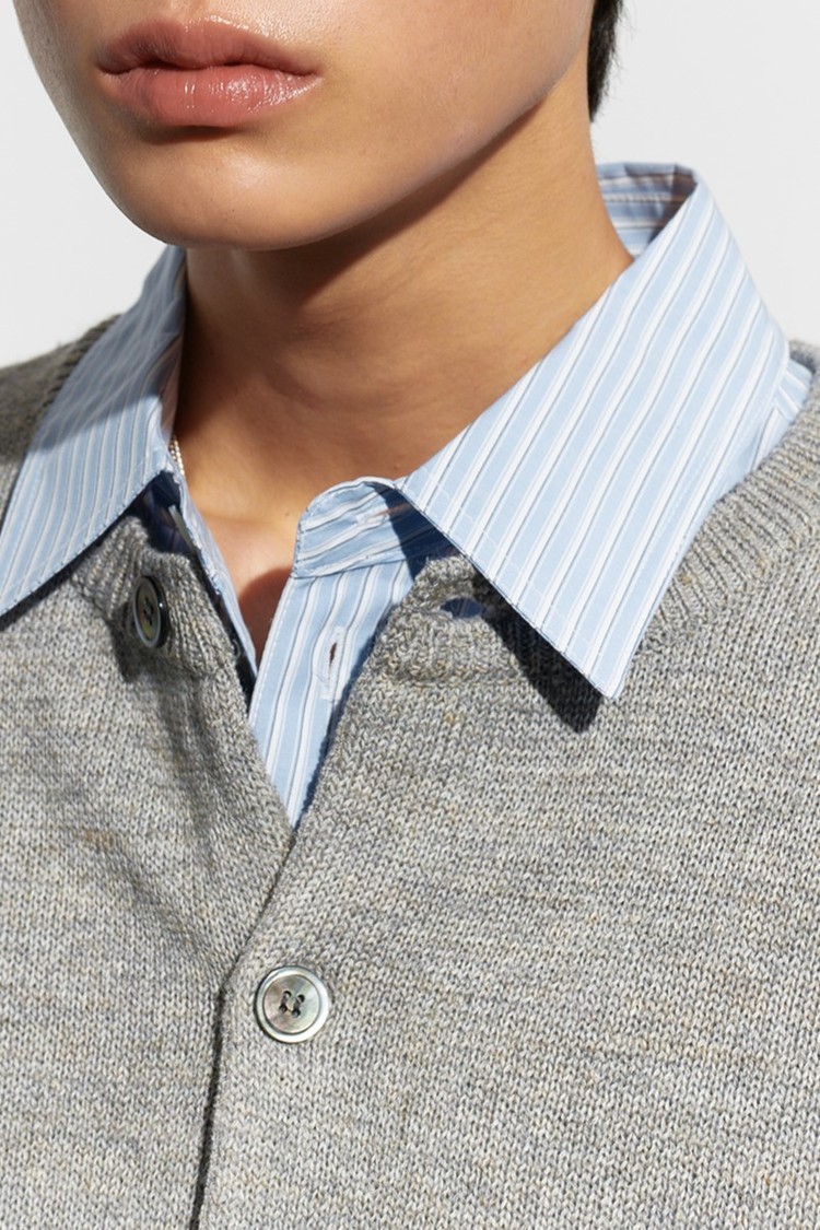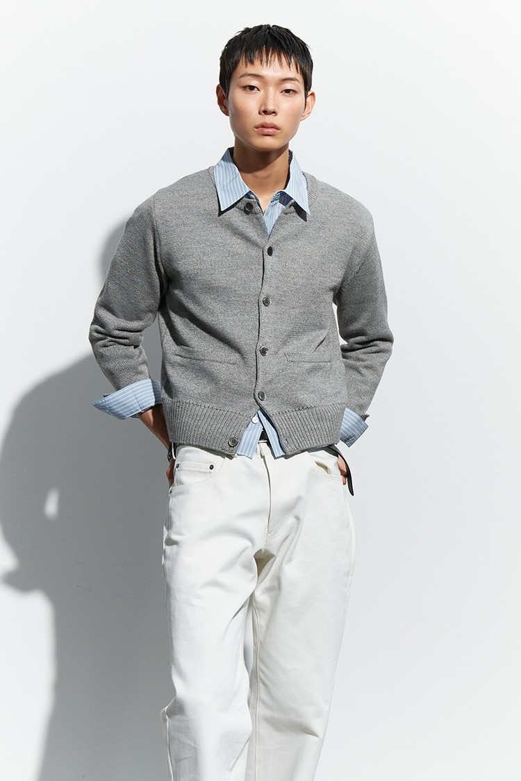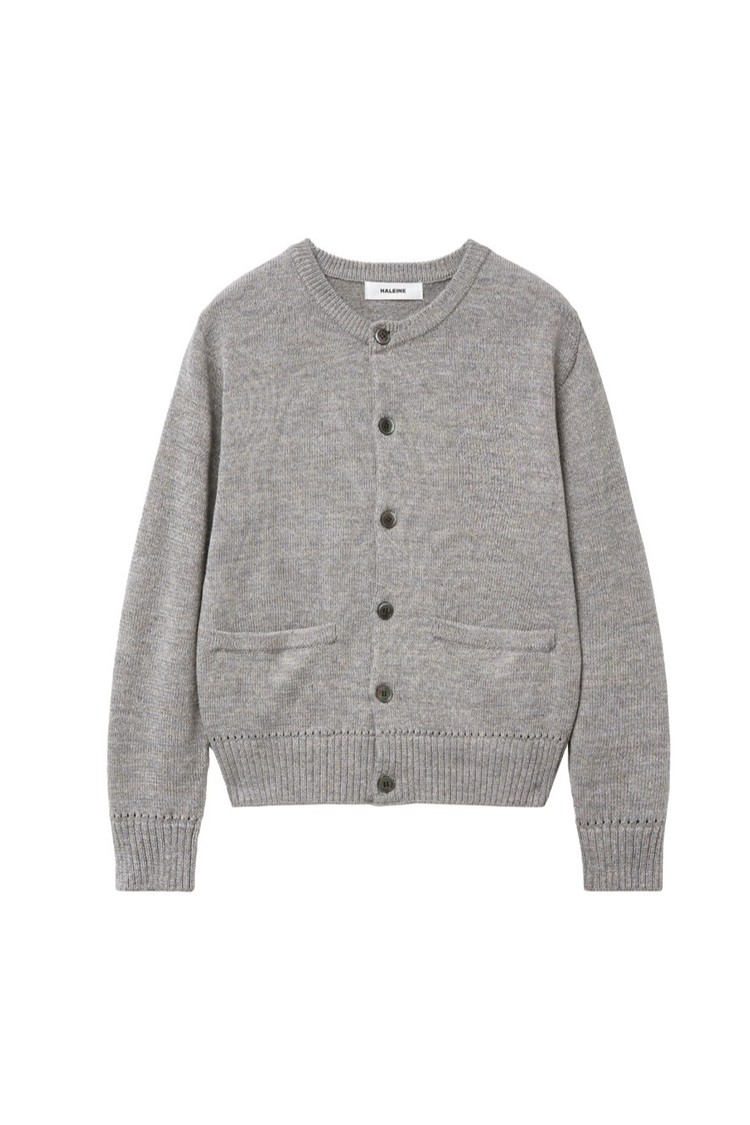 멜란지 텍스처의 울·리넨·코튼 혼방 원사로 제작된 라운드넥 가디건입니다.