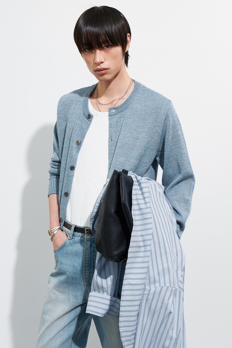 멜란지 텍스처의 울·리넨·코튼 혼방 원사로 제작된 라운드넥 가디건입니다.