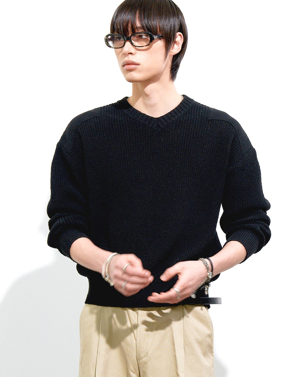 코만도 니트에서 착안한 숄더 패치를 적용해 밀리터리 디테일을 모던한 구조로 재해석했습니다.