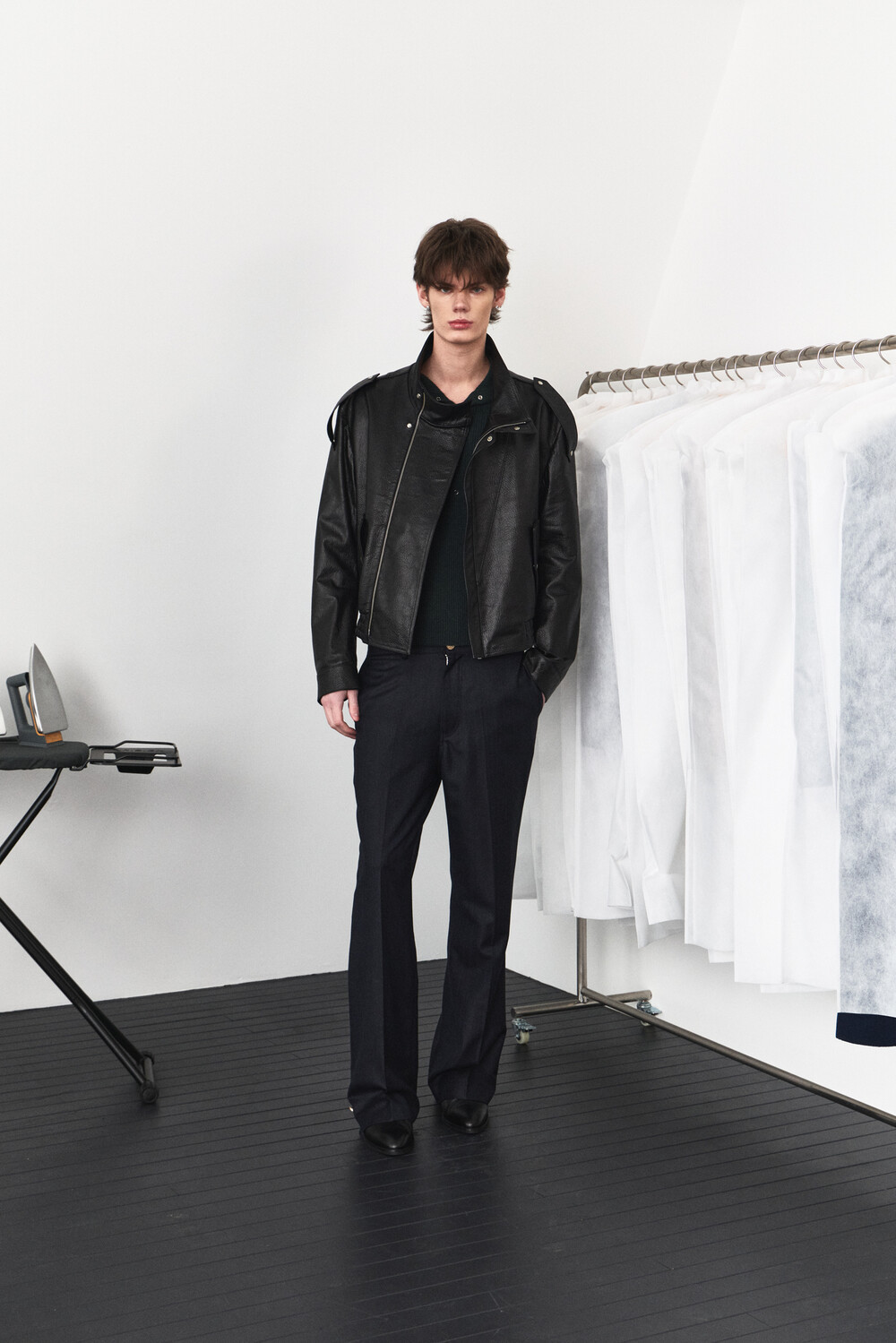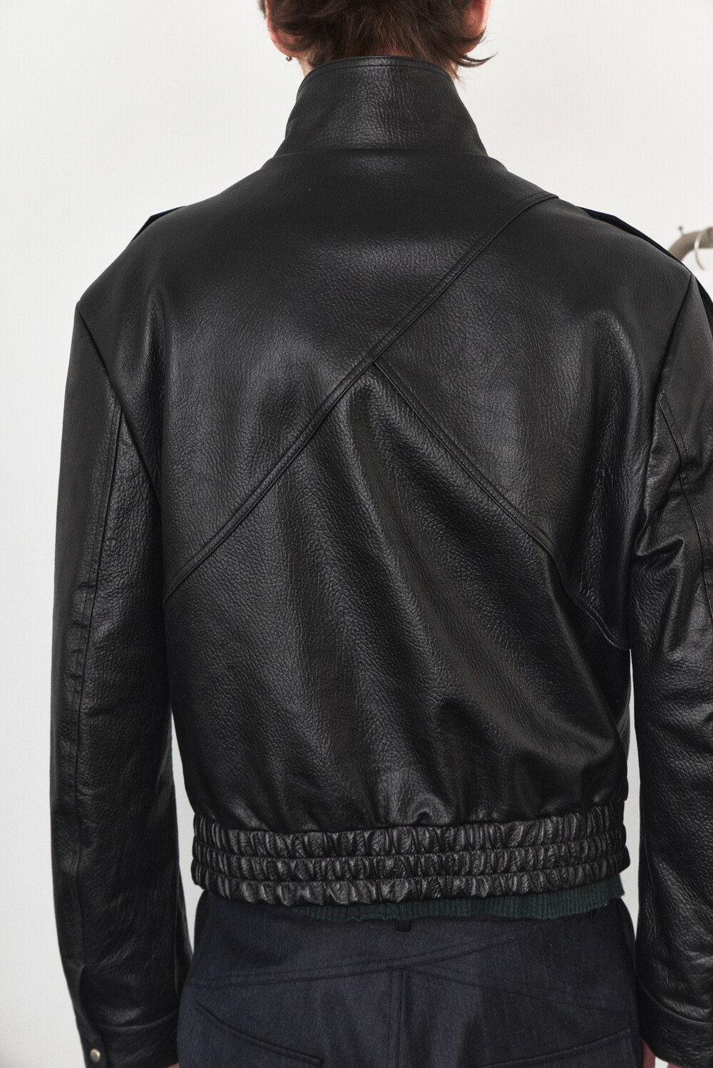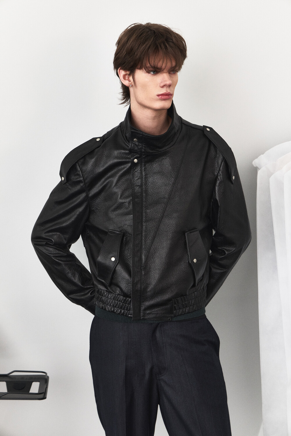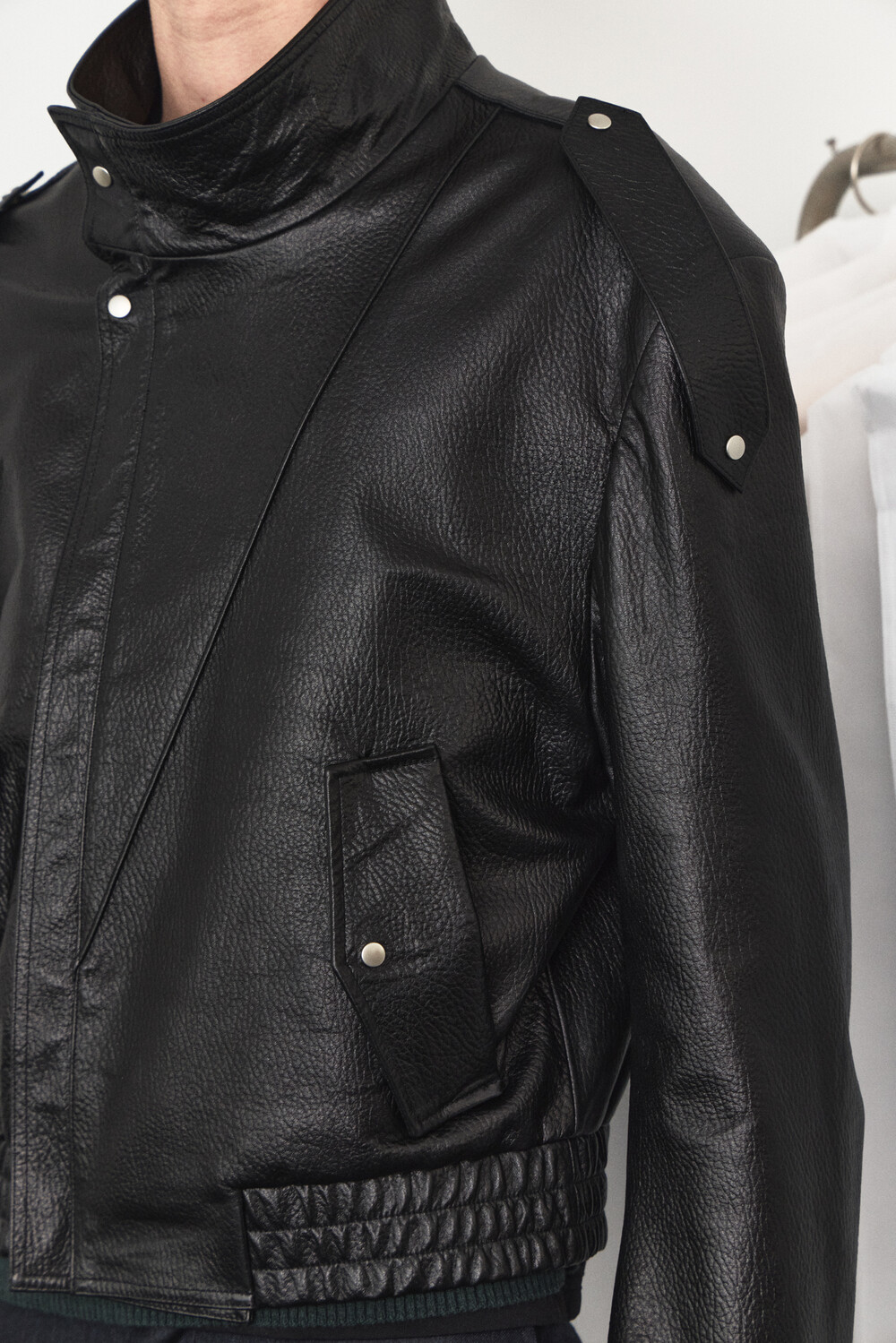 - 램 스킨 가죽을 활용한 하이넥 레더 자켓 디자인