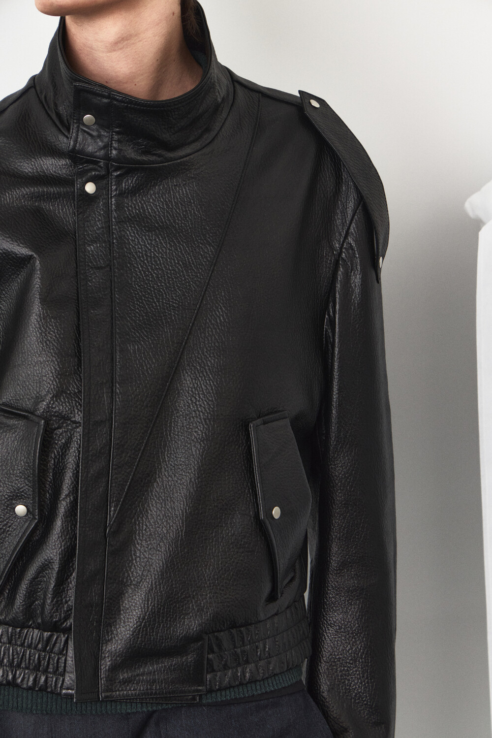 Epaulet High-Neck Leather Jacket Black