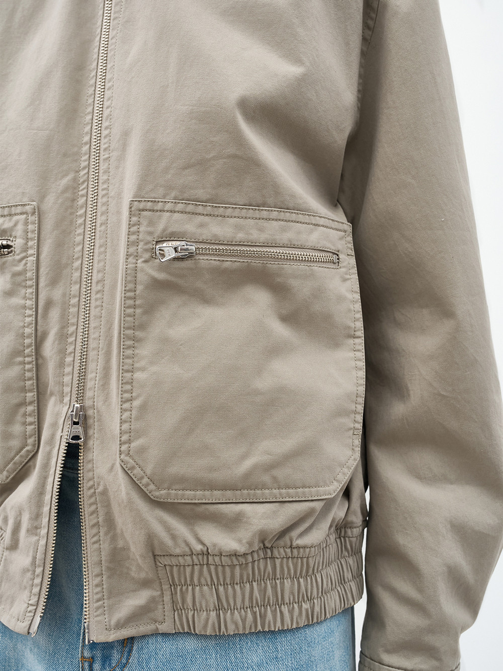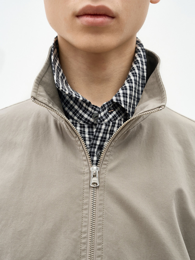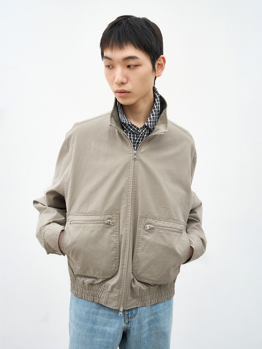 구조적이고 묵직한 분위기를 담아낸 집업 블루종. 바이오 워싱 공정을 거쳐 매끈한 터치감과 탄탄한 밀도감을 구현한 고밀도 코튼 소재. YKK 지퍼를 적용한 이중 구조의 프론트 포켓으로 실용성과 시각적 미학의 정교한 밸런스 완성. 짧은 기장과 여유로운 실루엣의 조화로 현대적인 스타일 감각을 선명하게 드러내는 매력적인 아이템.