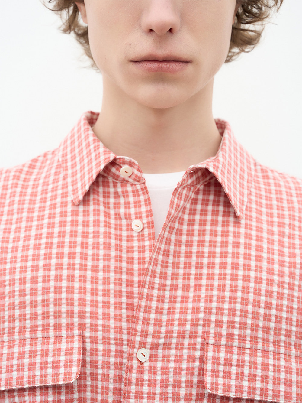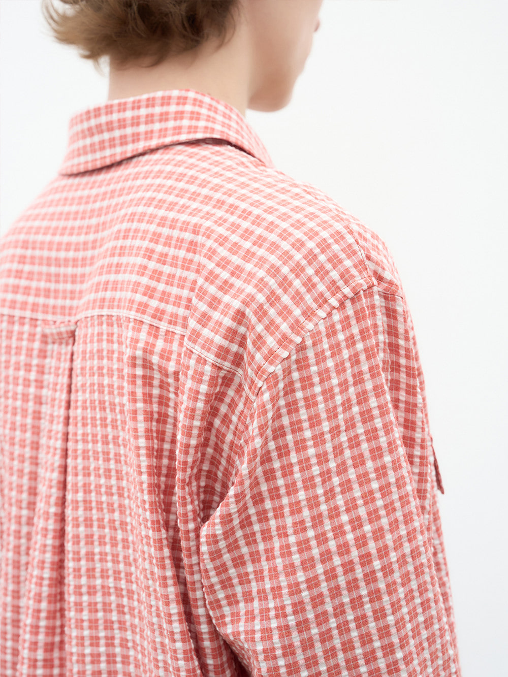 어린 시절의 향수를 자극하는 깅엄 체크 셔츠. 코튼 폴리 혼방 패브릭과 와샤 프로세싱의 결합으로 구현한 입체적인 조직감. 라운드 커팅된 투 포켓 디테일과 크롭 기장의 조화를 통해 경쾌함과 동시대적인 실루엣. 캣츠아이(Cats Eye) 자개 단추와 얇은 폭의 커프스 디자인이 선사하는 정제된 인상. 고유의 자연스러운 매력으로 다양한 캐주얼 룩에 유연하게 스며드는 높은 활용도의 아이템.