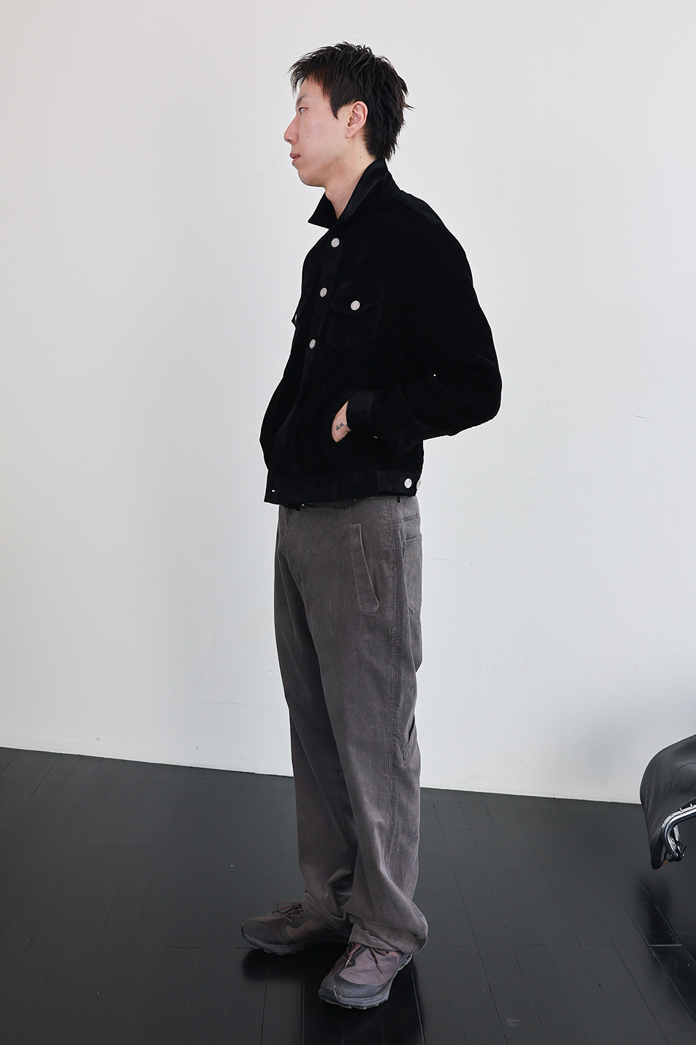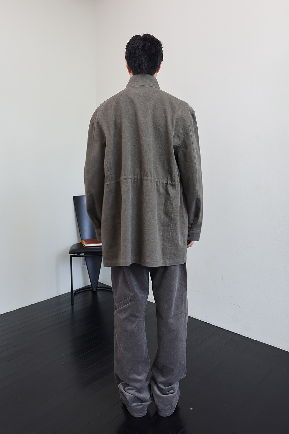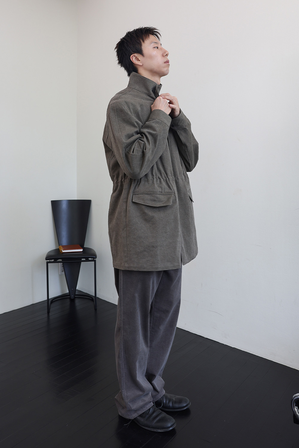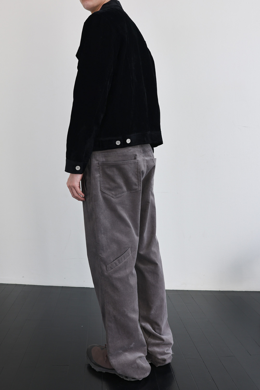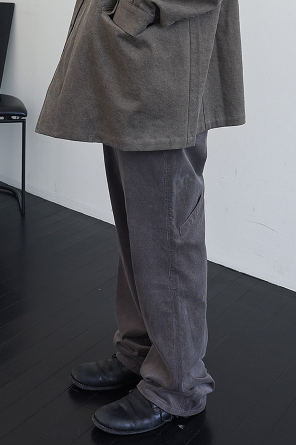 뒤판 종아리 부근에 위치한 포인트 포켓 디테일은 위트 있는 조형미를 보여줍니다.