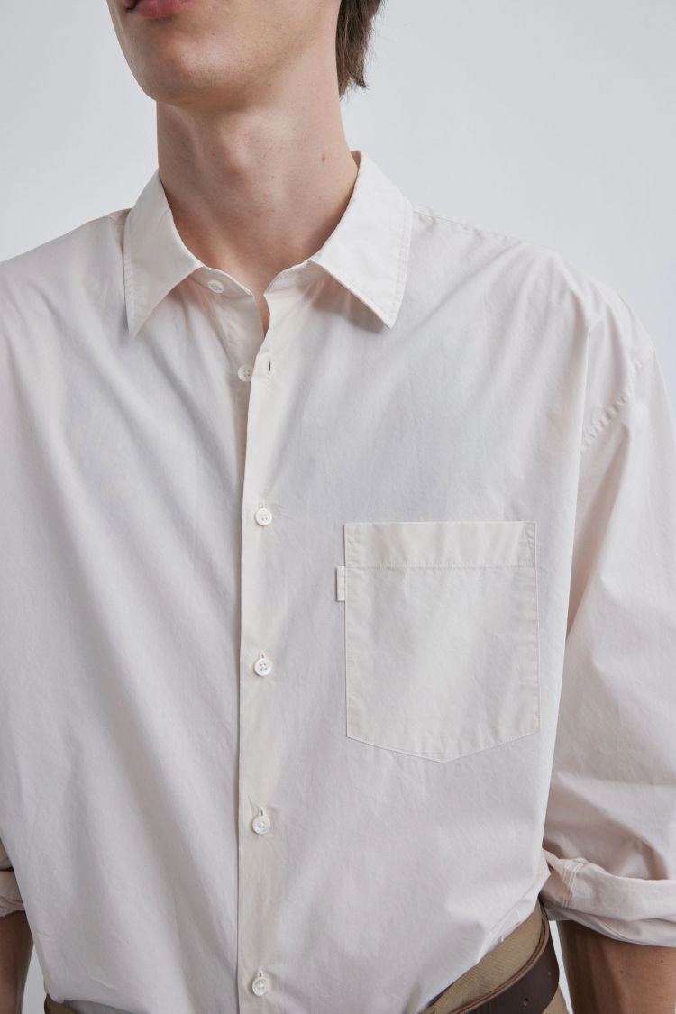 섬유의 길이가 긴 희소한 프리미엄 코튼을 사용하여 만든 고밀도 원단(타입라이터)입니다. 실을 빈틈없이 아주 촘촘하게 짜내어 얇지만 튼튼하고, 특유의 바스락거리는 질감이 매력적입니다. 특수 공정을 통해 원단 표면의 잔털을 깨끗하게 정리하여 은은하고 매끄러운 광택이 감돌며, 세탁 후 생기는 자연스러운 잔주름마저 멋스럽게 느껴집니다. 가볍지만 밀도가 높아 비침이 적고 사계절 내내 쾌적하게 착용할 수 있습니다.