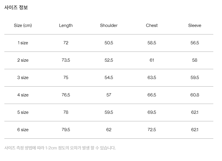 사이즈 측정 방법에 따라 오차가 발생할 수 있으며, 교환반품 사유에 해당하지 않습니다.