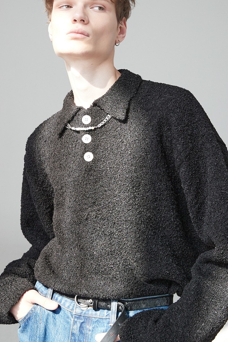 BLACK V-mesh detail alpaca bocle collar knit(OT211)