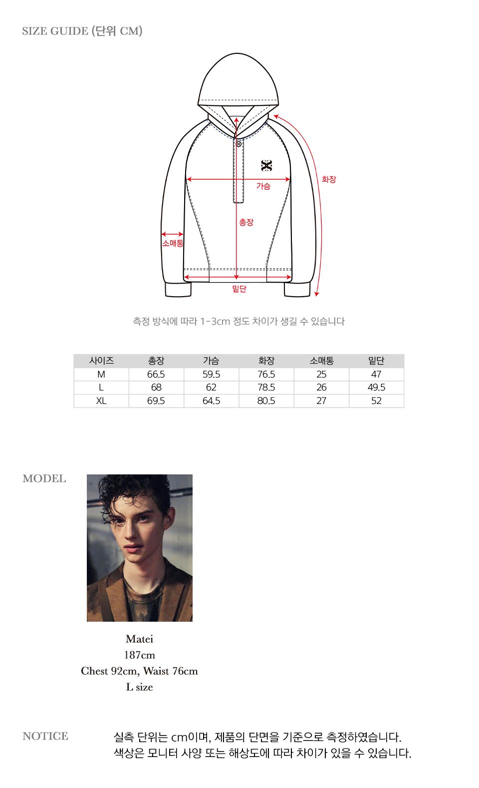 사이즈 측정 방법에 따라 오차가 발생할 수 있으며, 교환반품 사유에 해당하지 않습니다.
