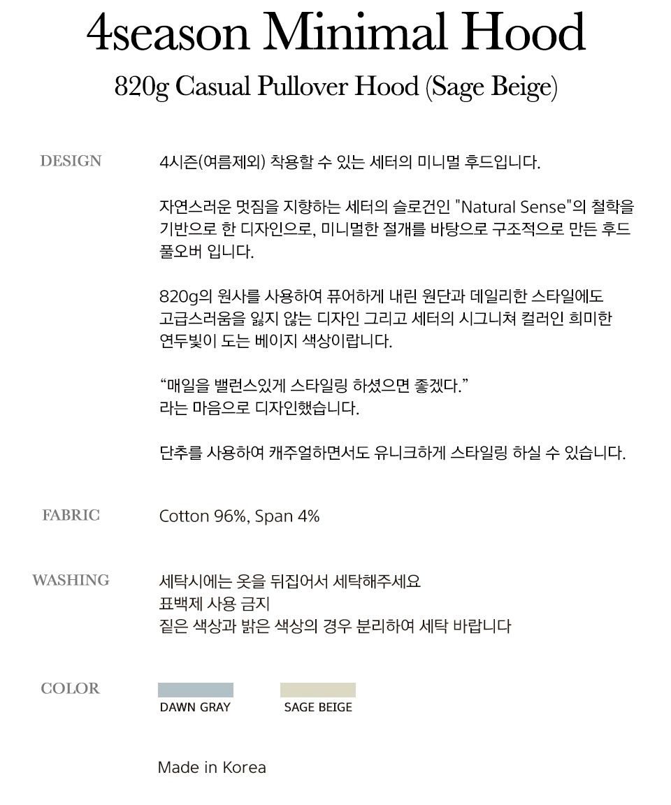 4시즌(여름제외) 착용할 수 있는 세터의 미니멀 후드입니다.