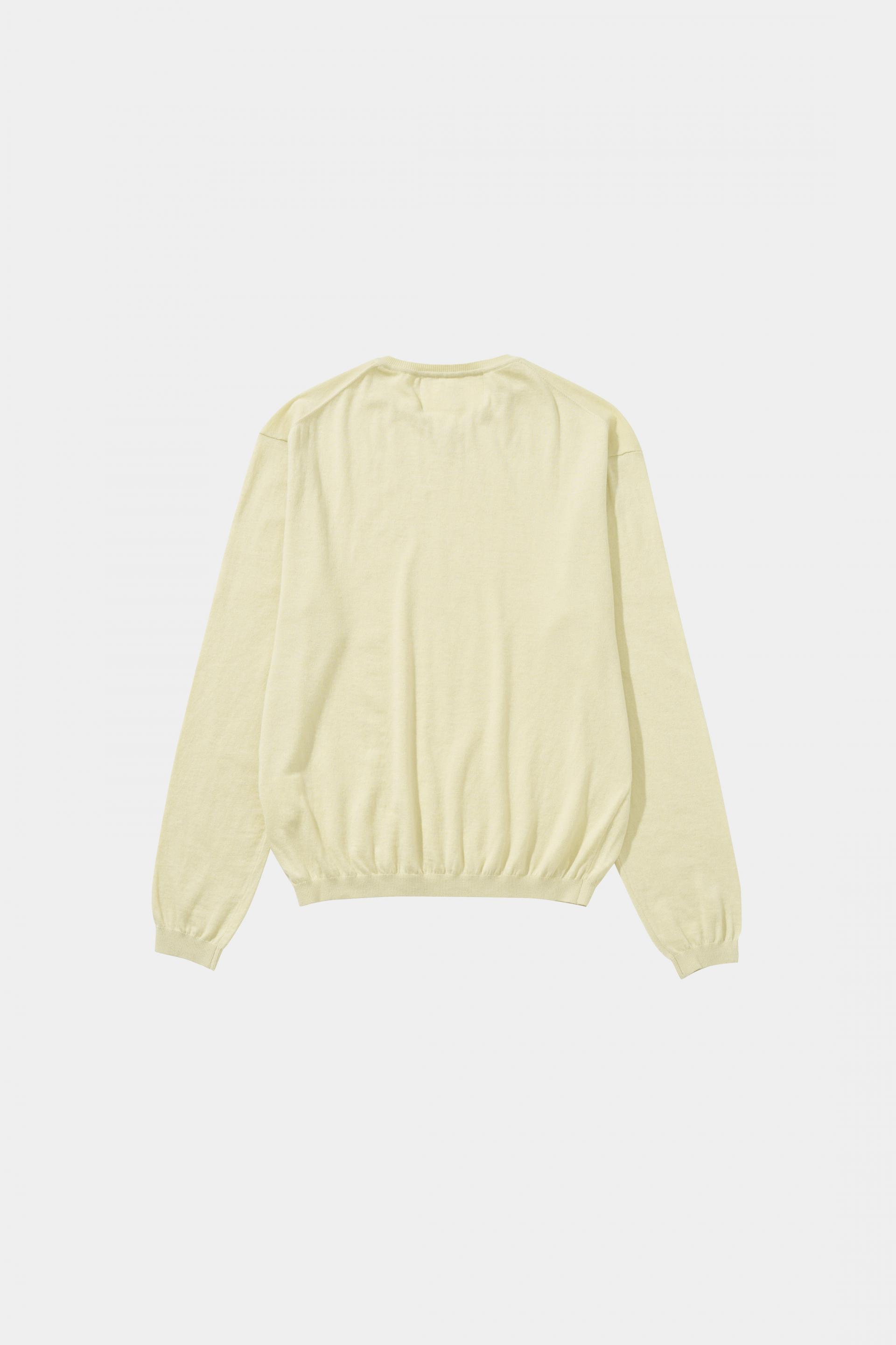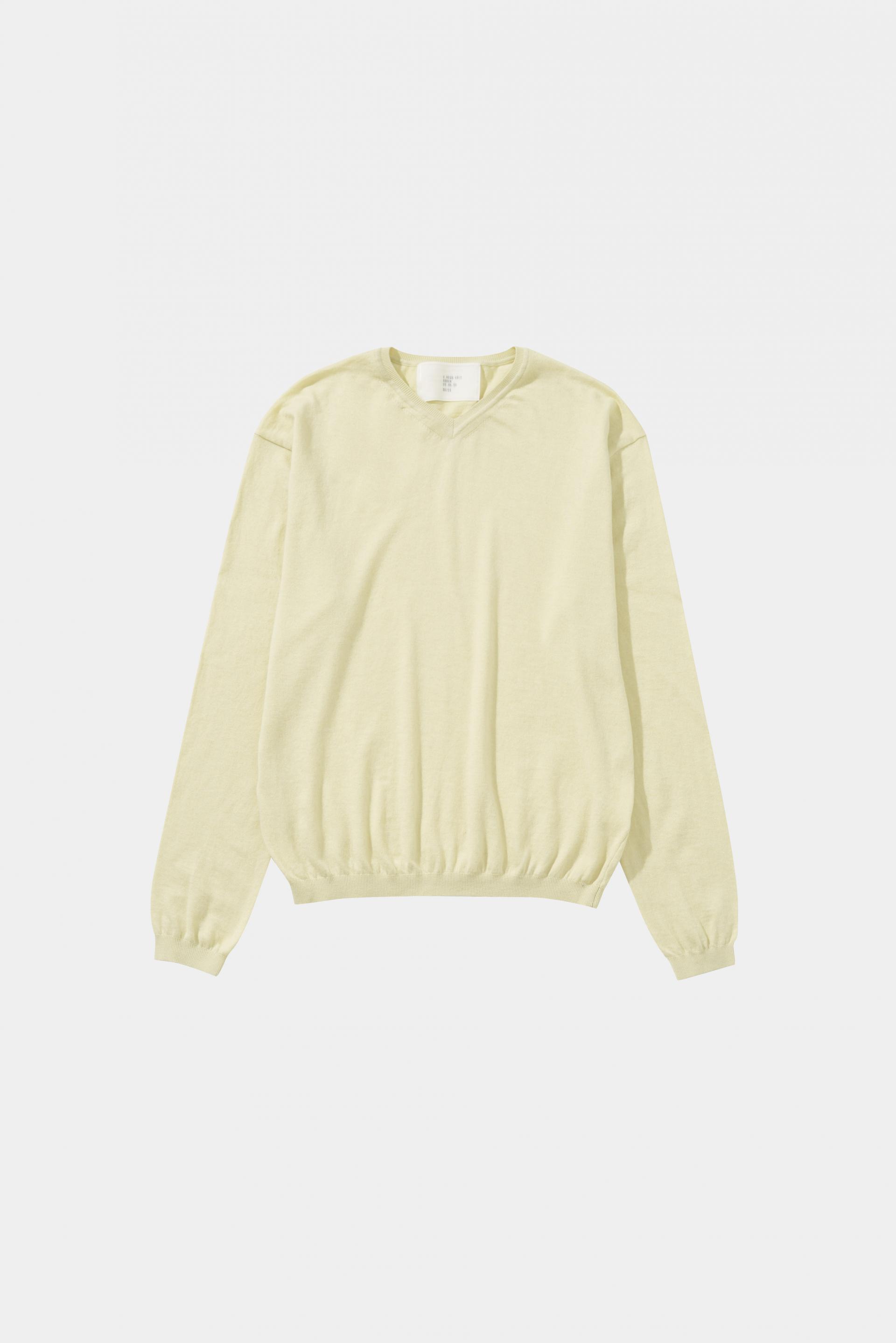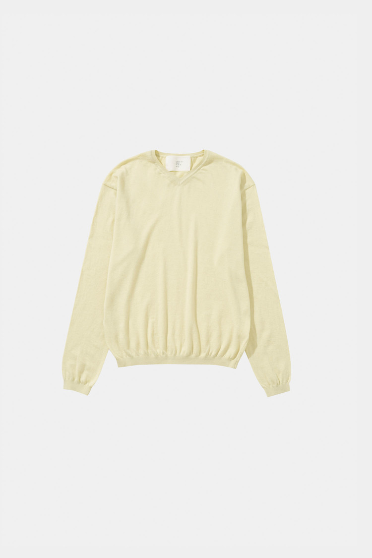 이번 시즌 처음 선보이는 V neck knit입니다. 코튼, 비스코스, 그리고 실크로 편직 된 실을 사용하여 14게이지의 얇은 골 형태로 편직 된 니트입니다.