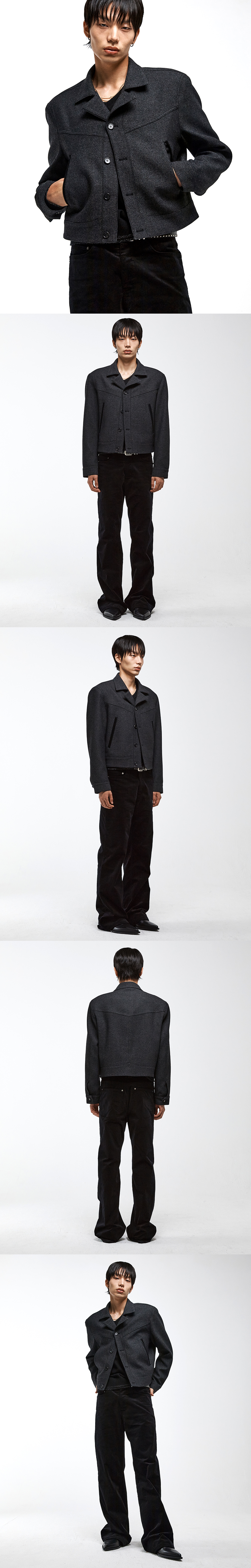 프런트·백 V라인 요크 절개와 인조 누벅 소재로 배색된 사선 웰트 포켓이 구조감을 더하며, 노치드 라펠과 천연 소뿔 단추가 클래식한 완성도를 높입니다.