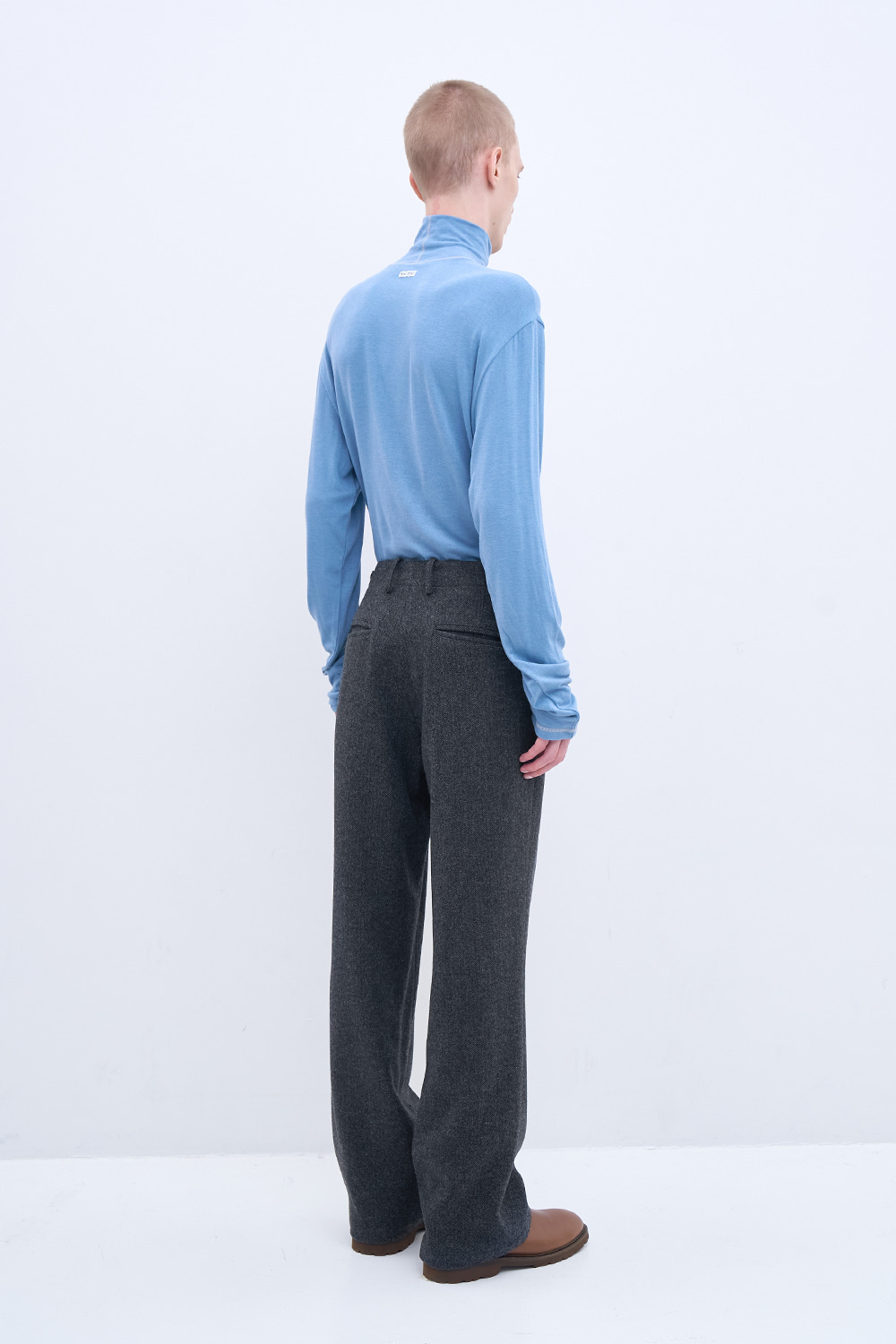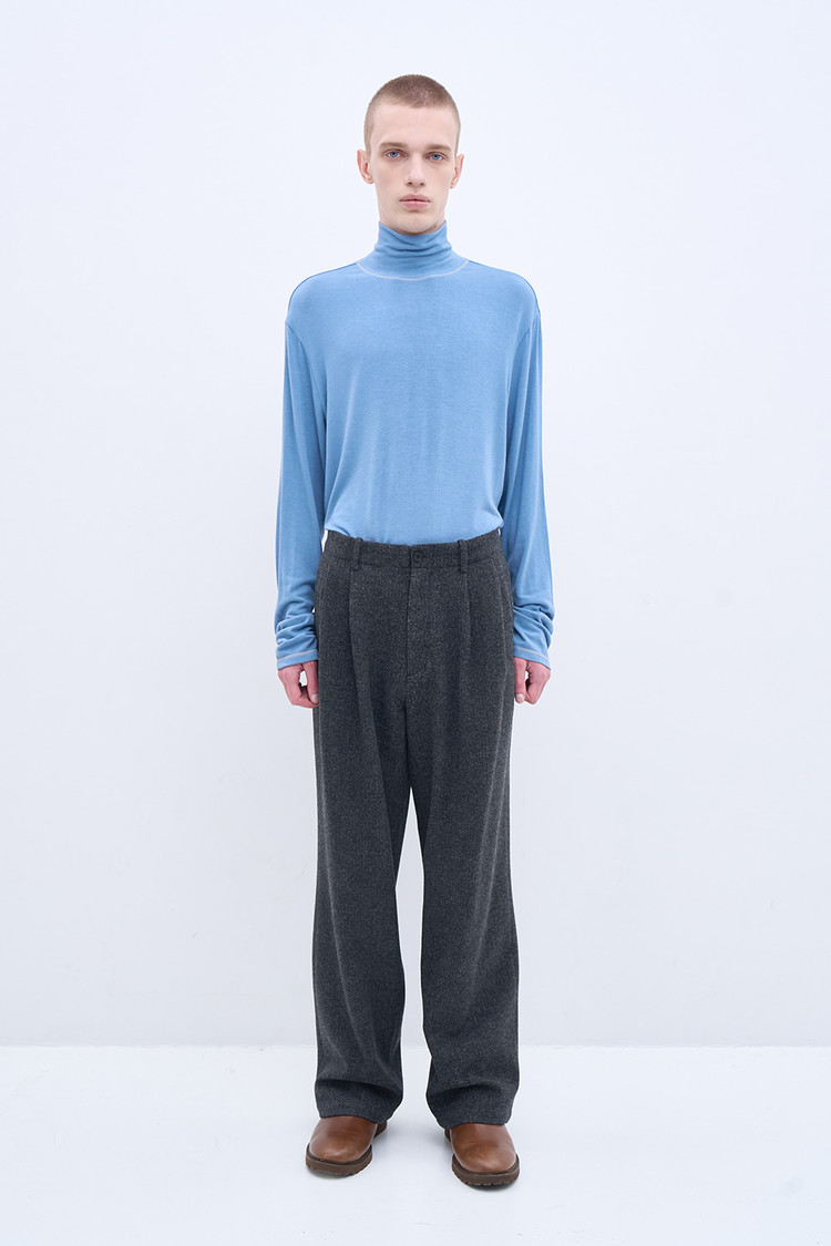 워크웨어 스타일에서 영감을 받아 완성된 유니폼 트라우저. 부드럽고 포근한 터치감이 특징인 플라넬 버진 울 소재.
