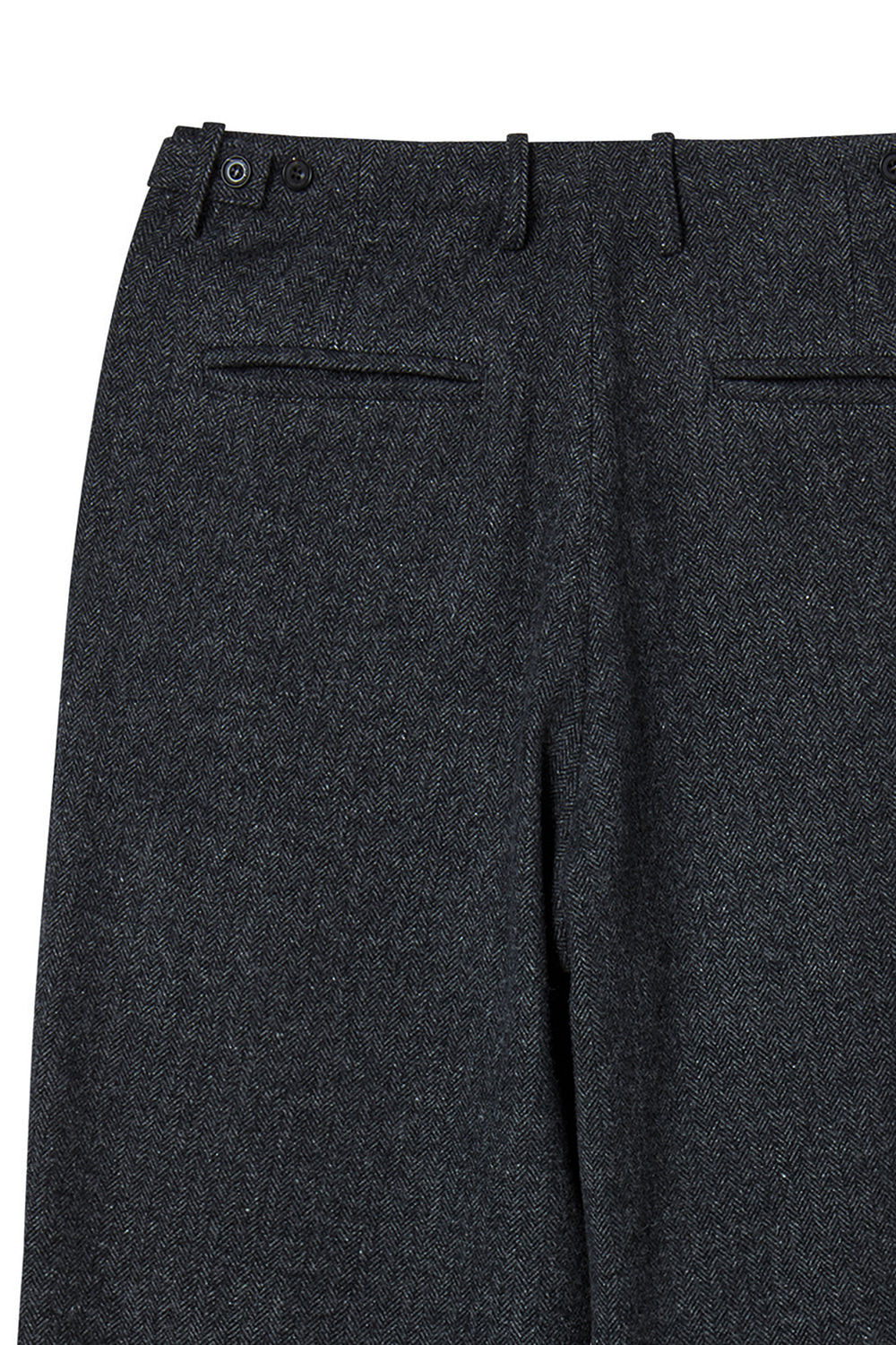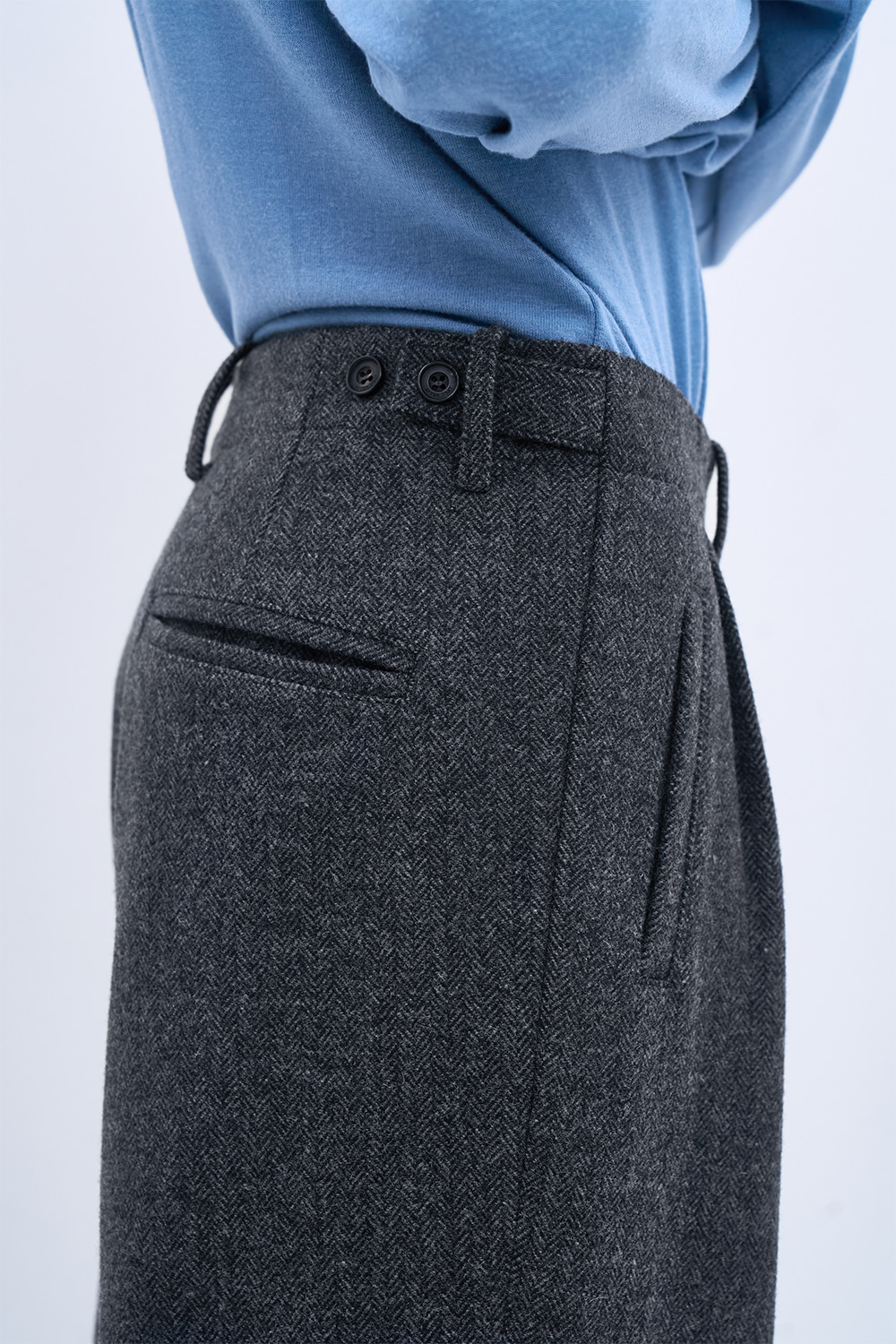 허리 오비의 제천 비조와 버튼 디테일을 통한 벨트리스 사이즈 조절 기능. 클래식 수트 팬츠의 정제된 디테일과 현대적인 실루엣의 조합.