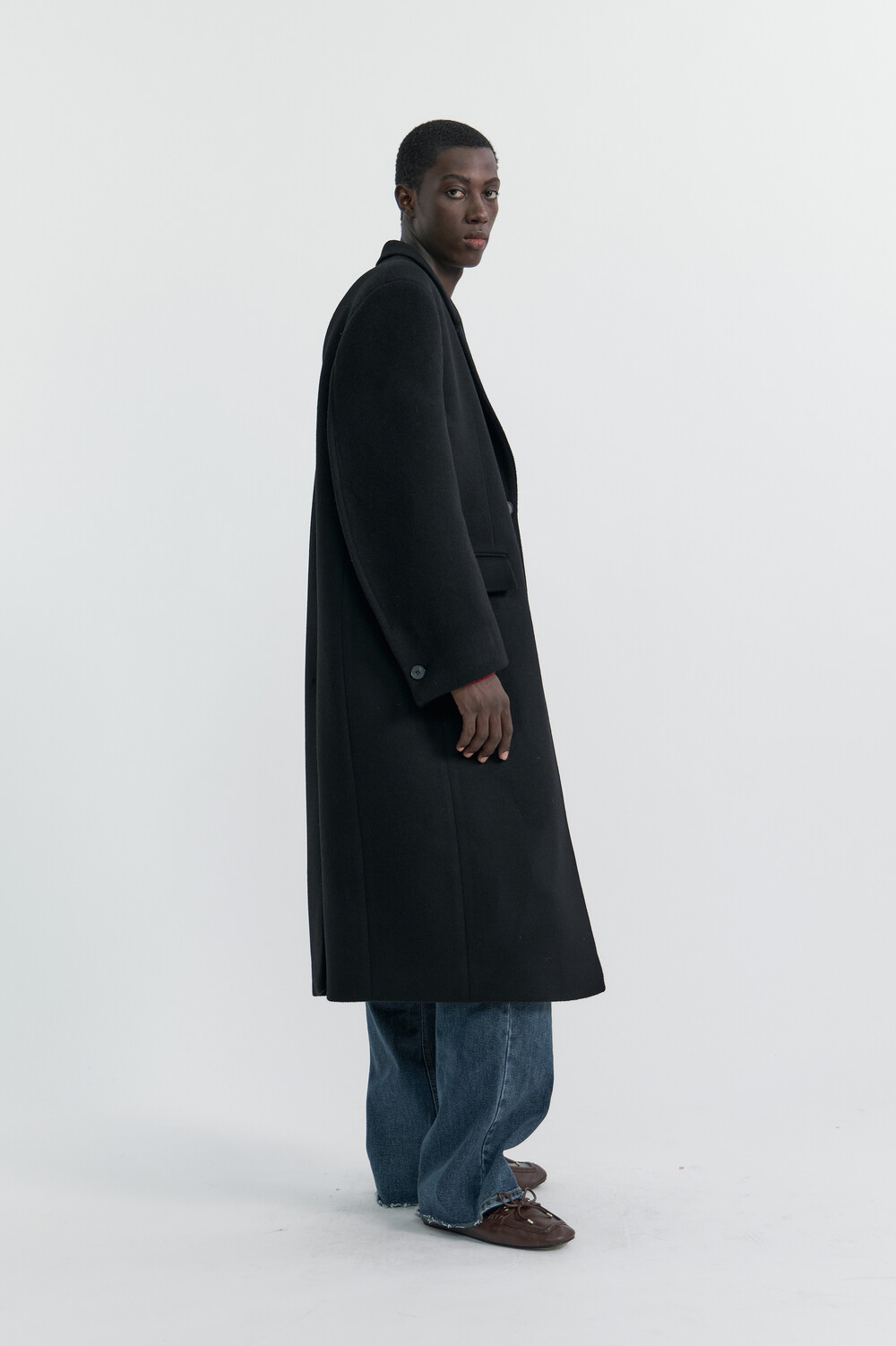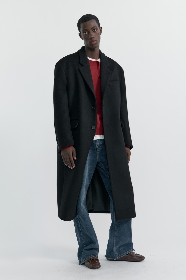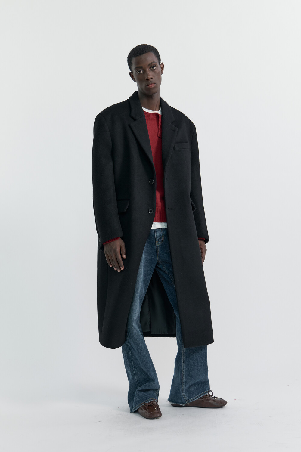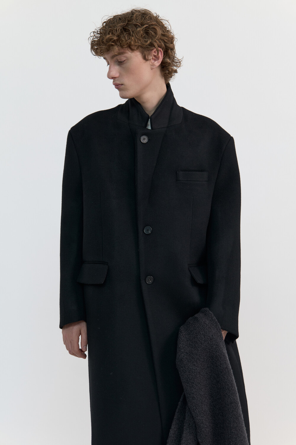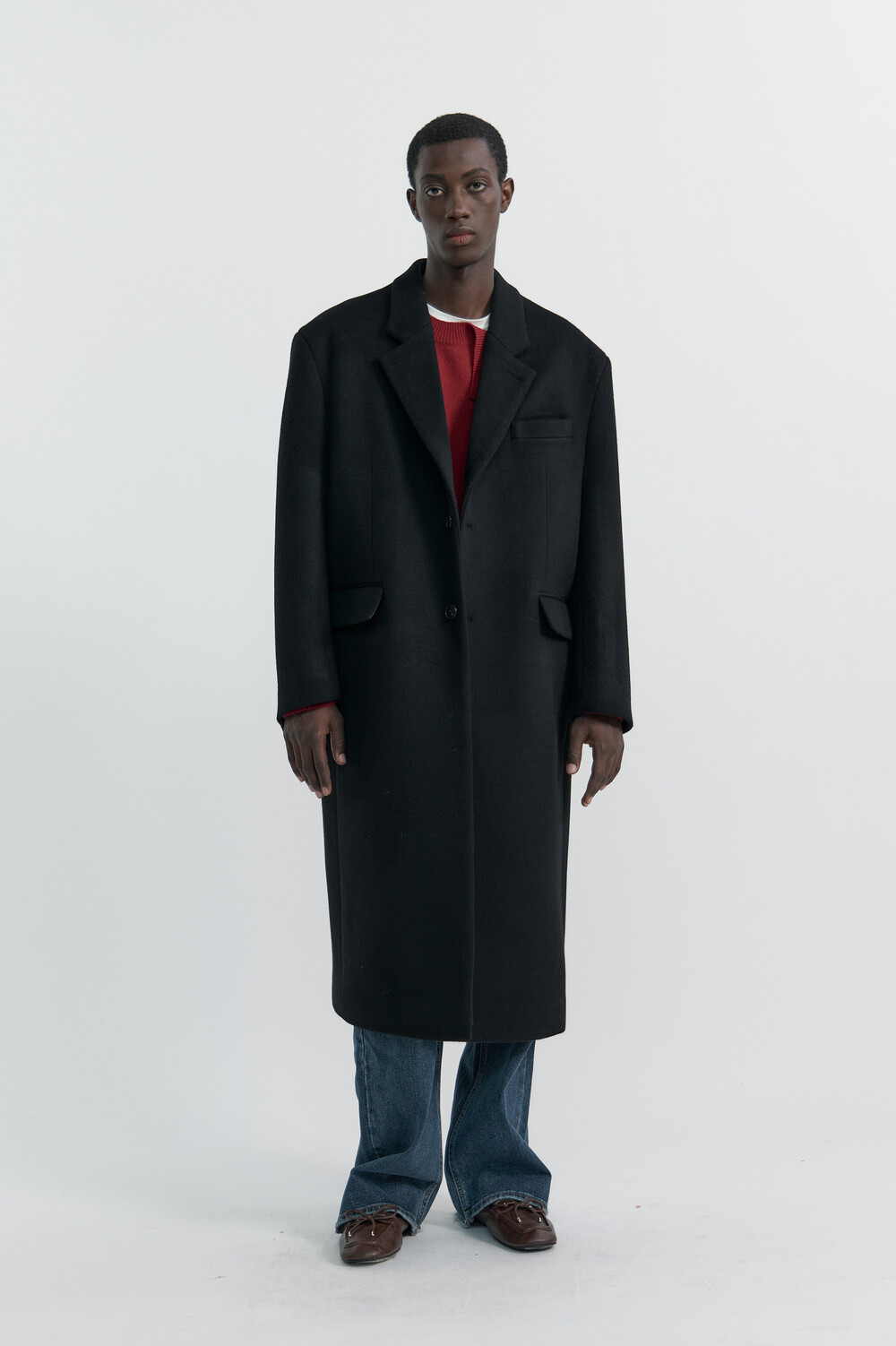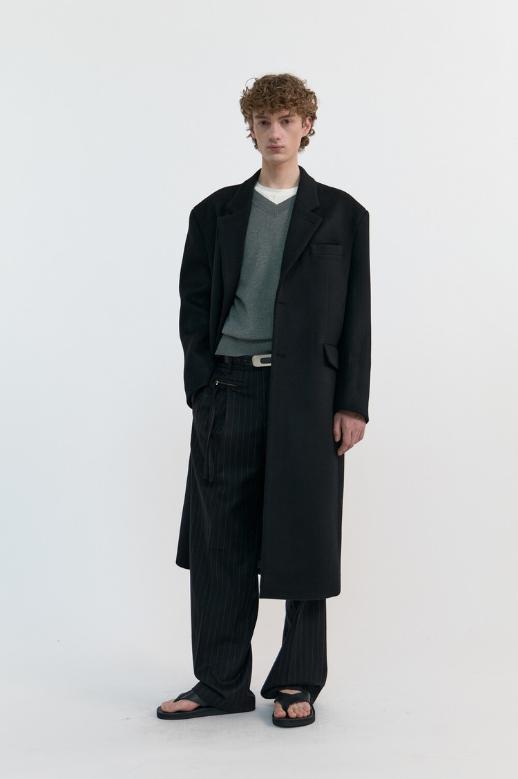 -중량감있는 방모울 소재와 세미오버사이즈 실루엣이 돋보이는 클래식 싱글 브레스티드 코트