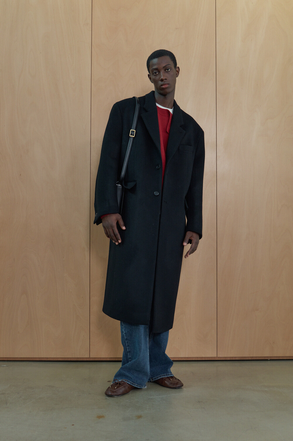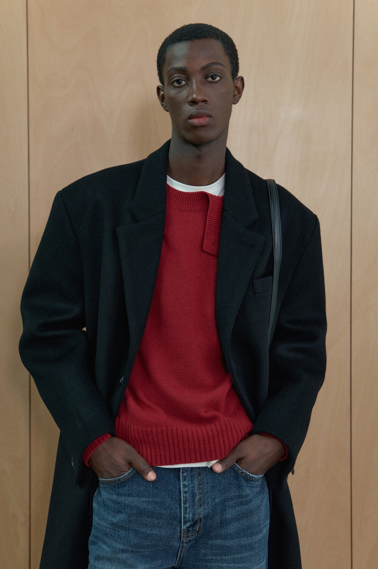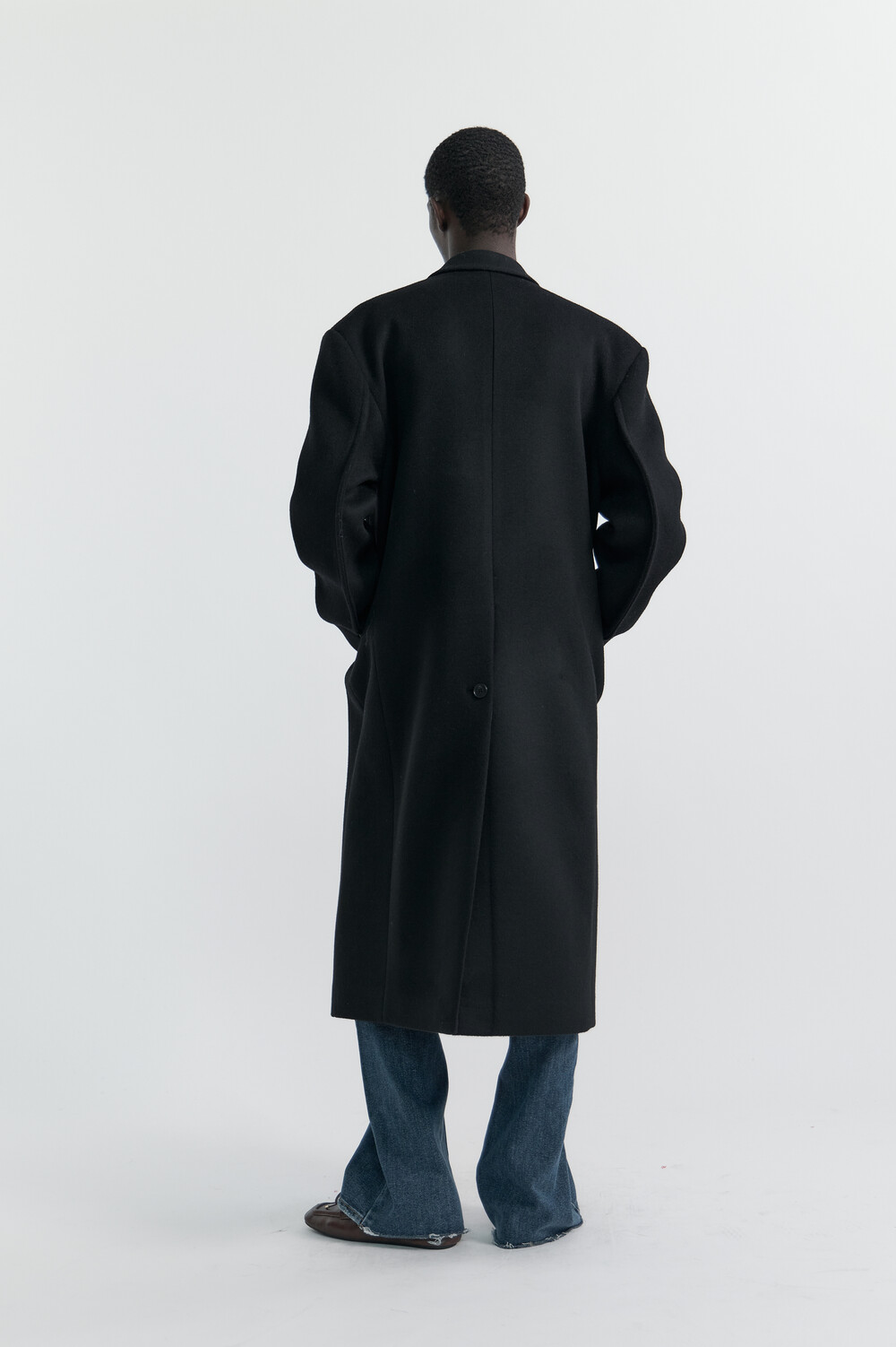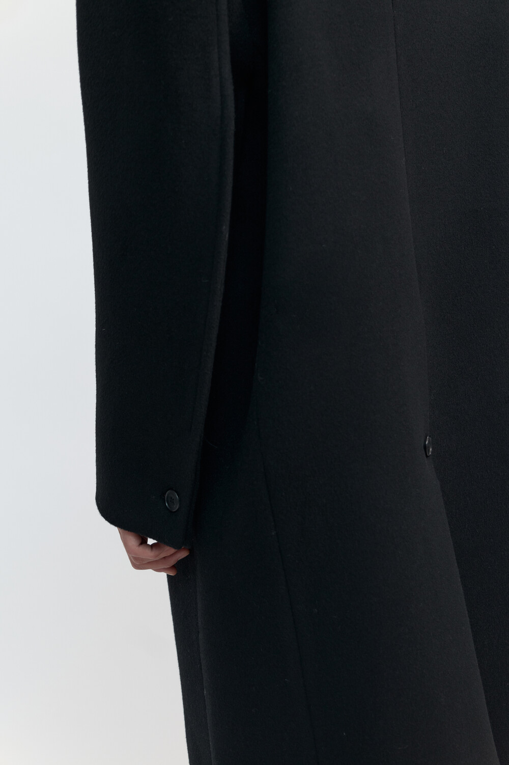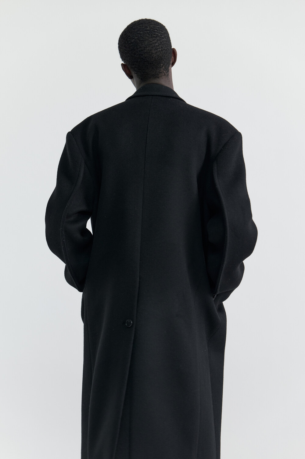 -중량감있는 방모울 소재와 세미오버사이즈 실루엣이 돋보이는 클래식 싱글 브레스티드 코트