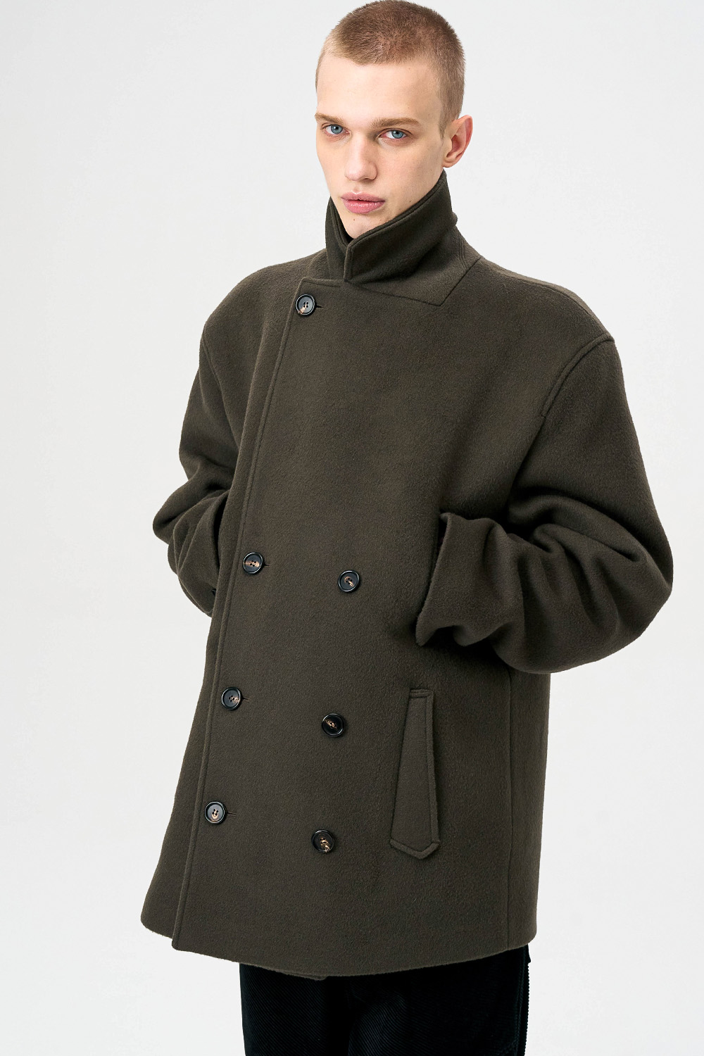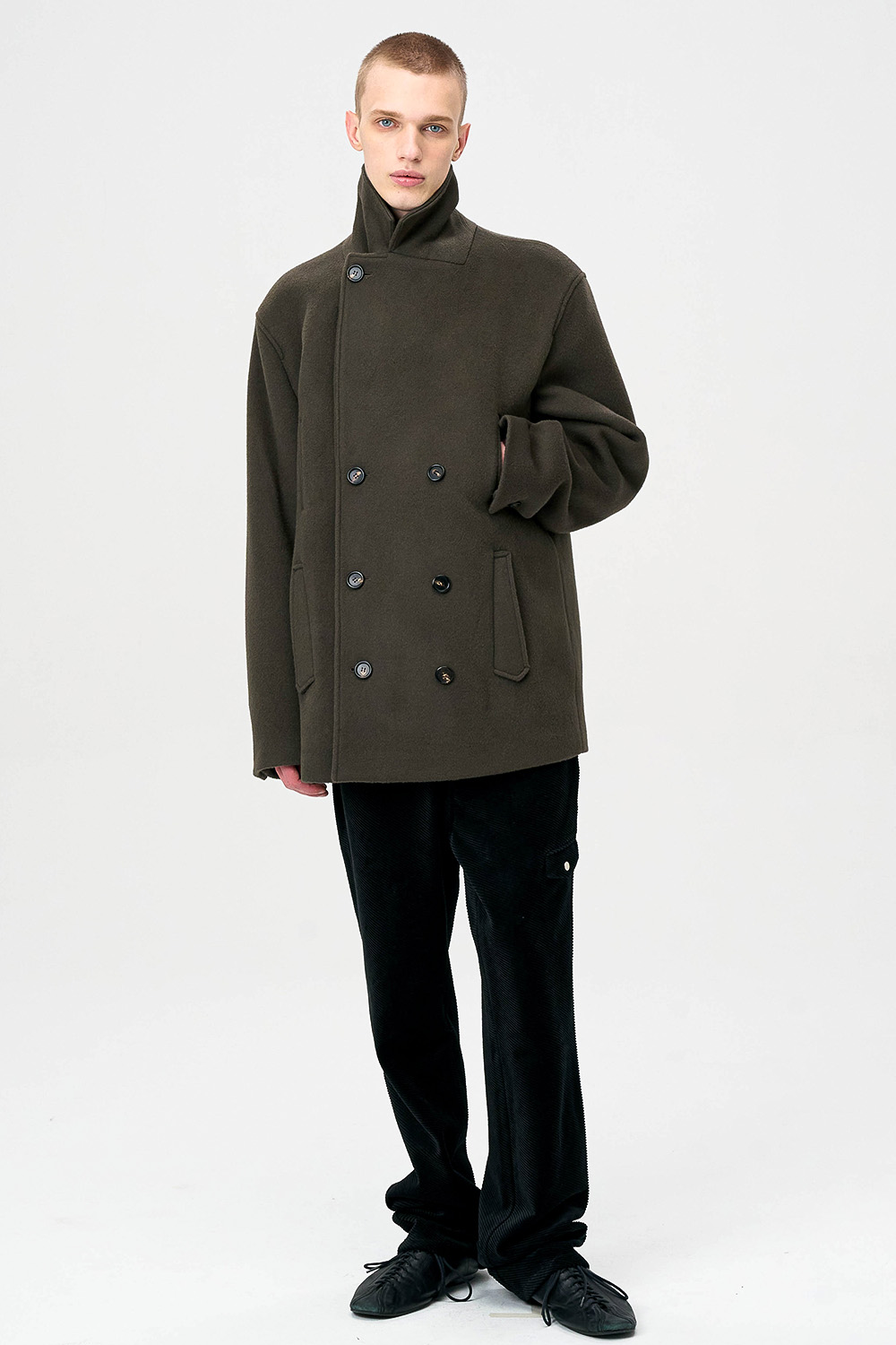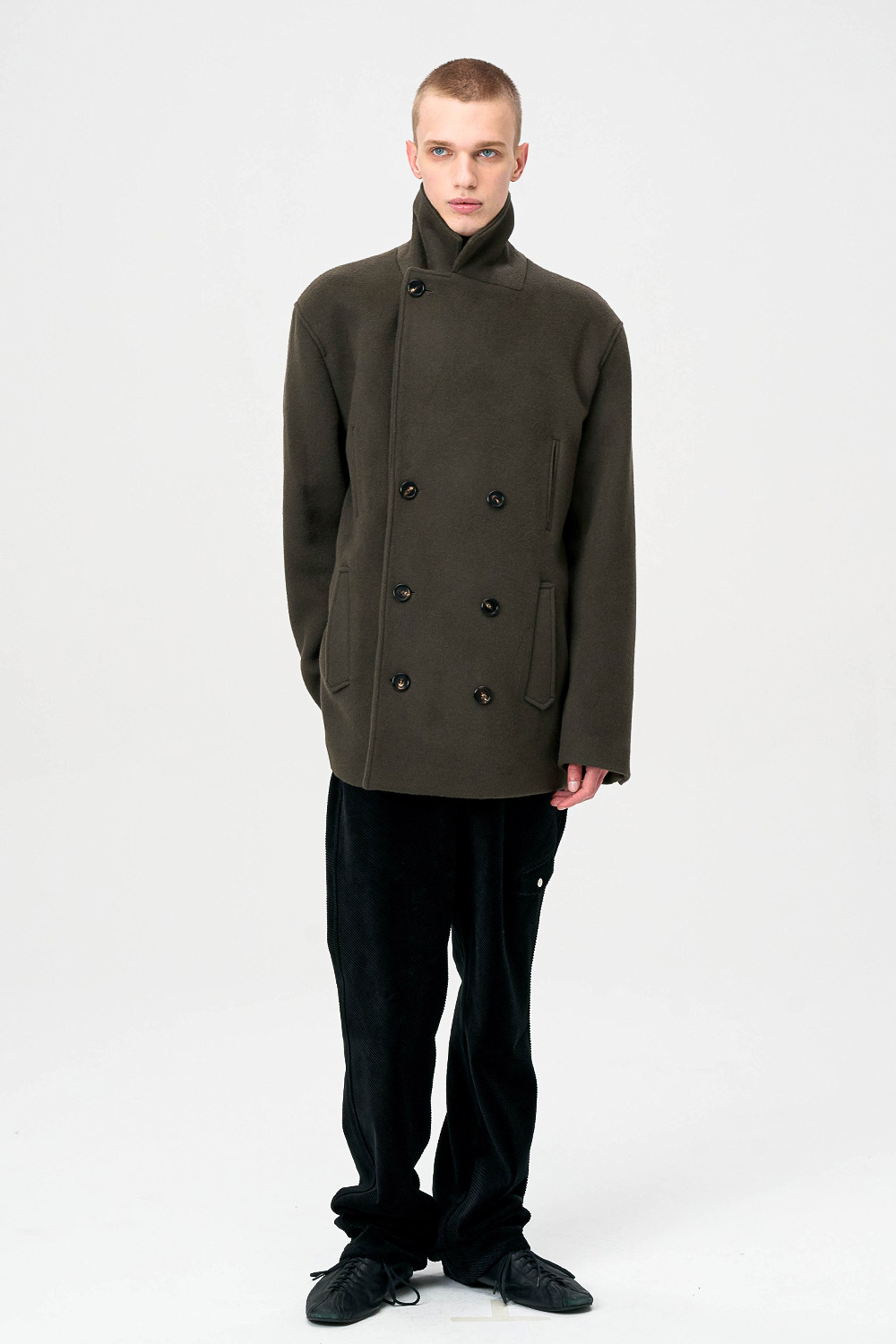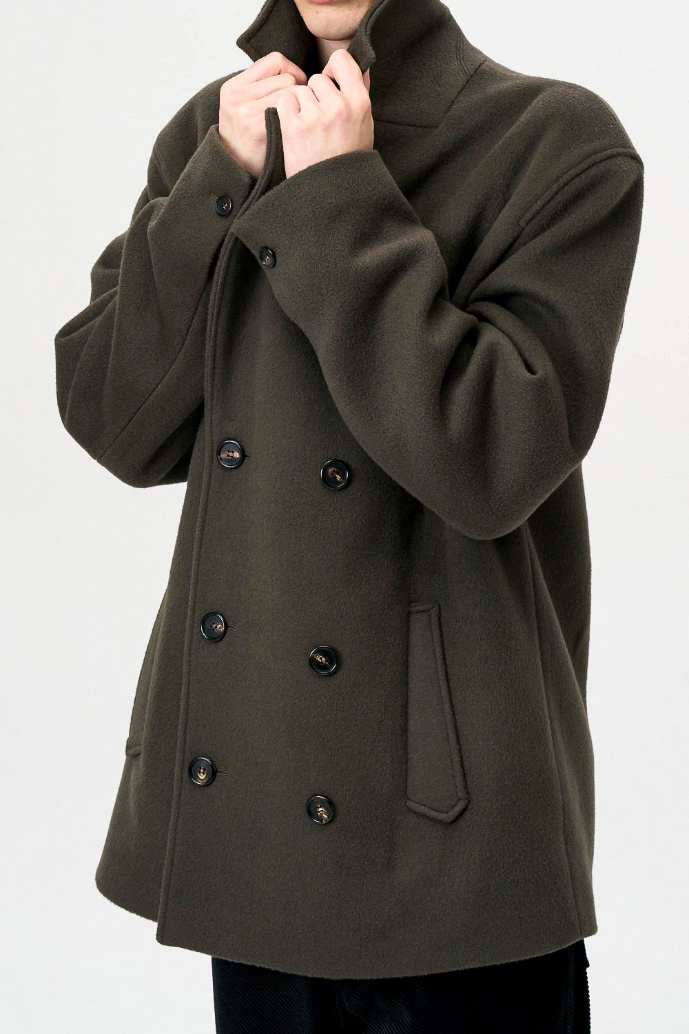 전통적인 피코트 구조를 현대적으로 재해석한 실루엣으로,
