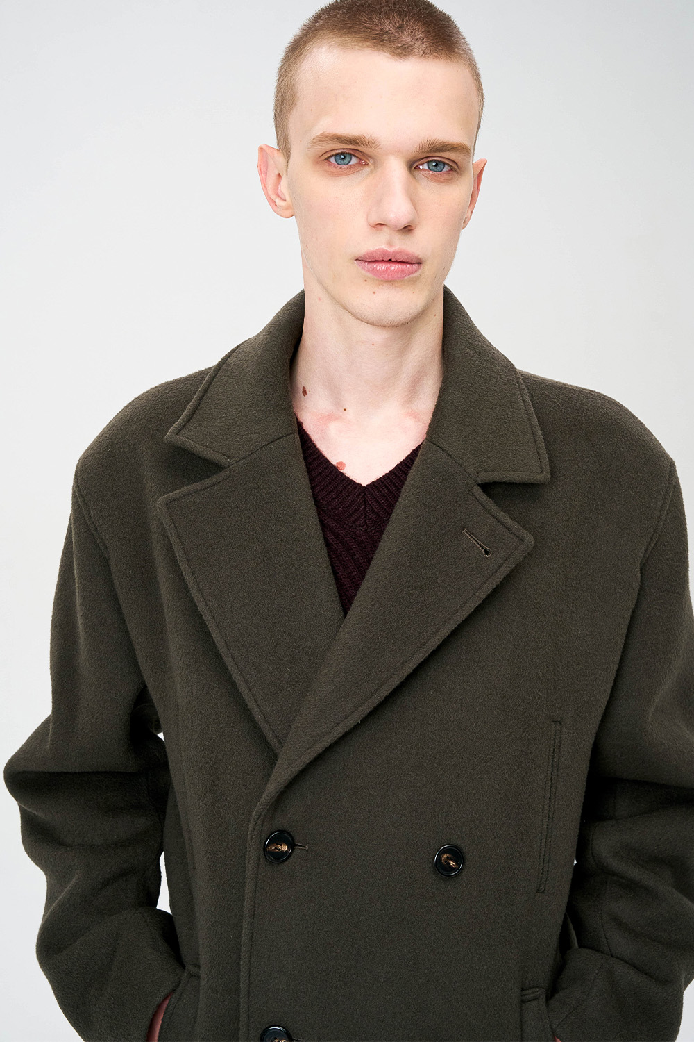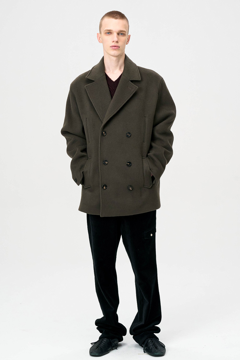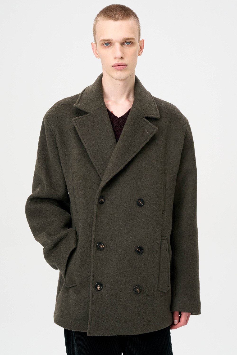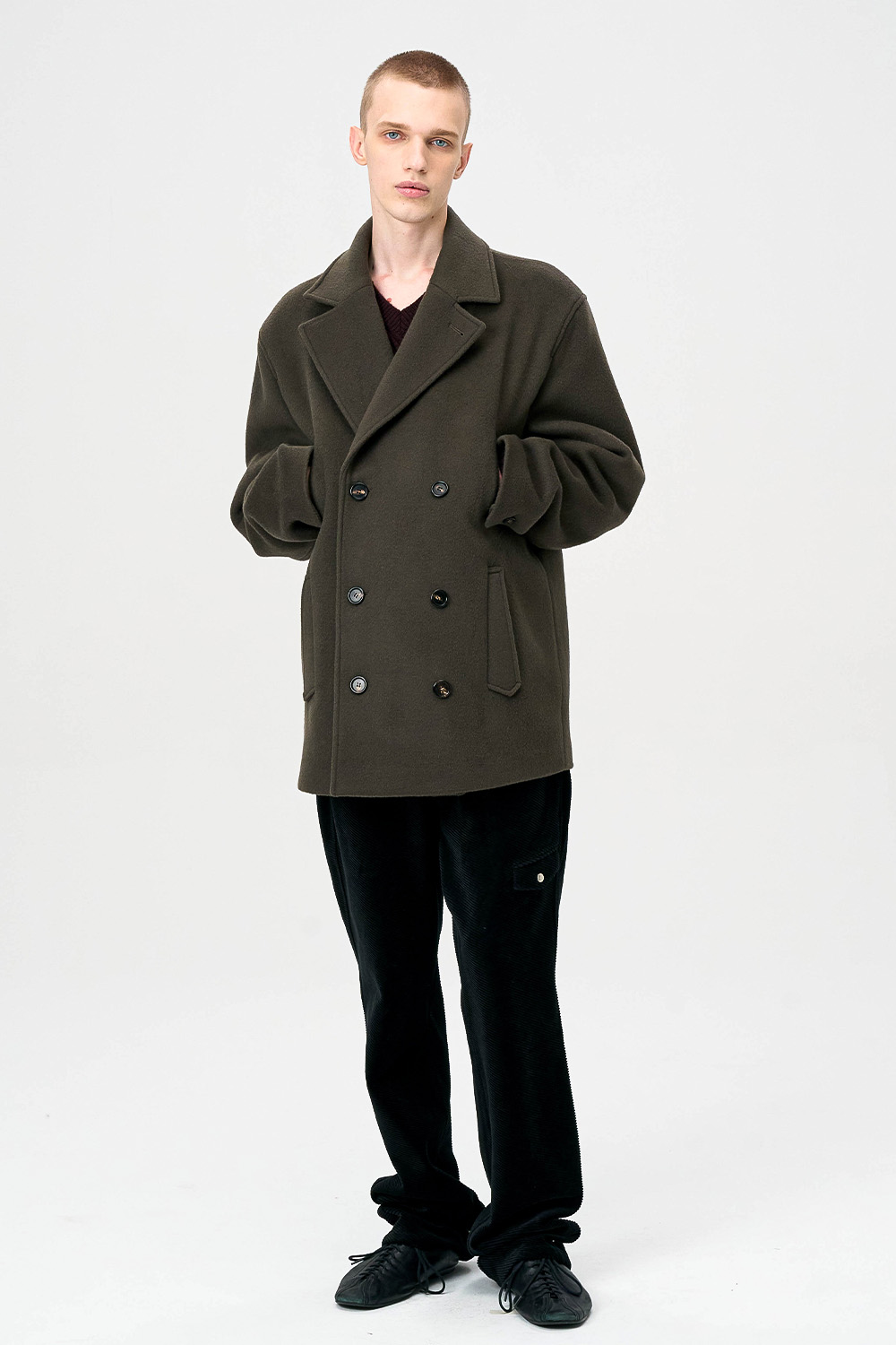 전통적인 피코트 구조를 현대적으로 재해석한 실루엣으로,