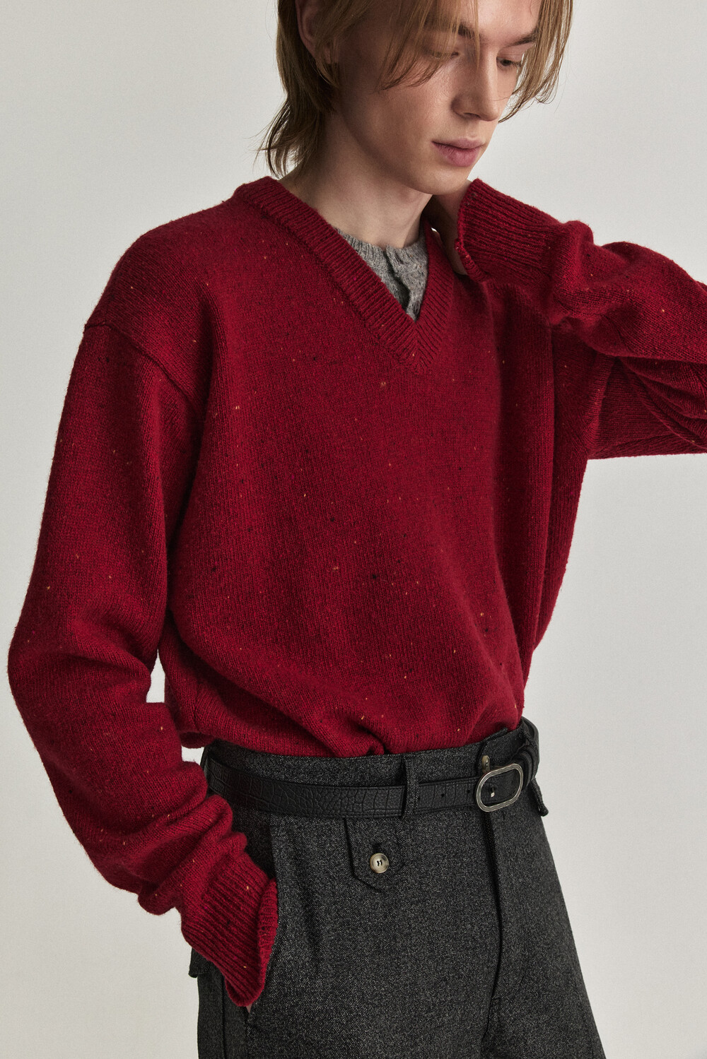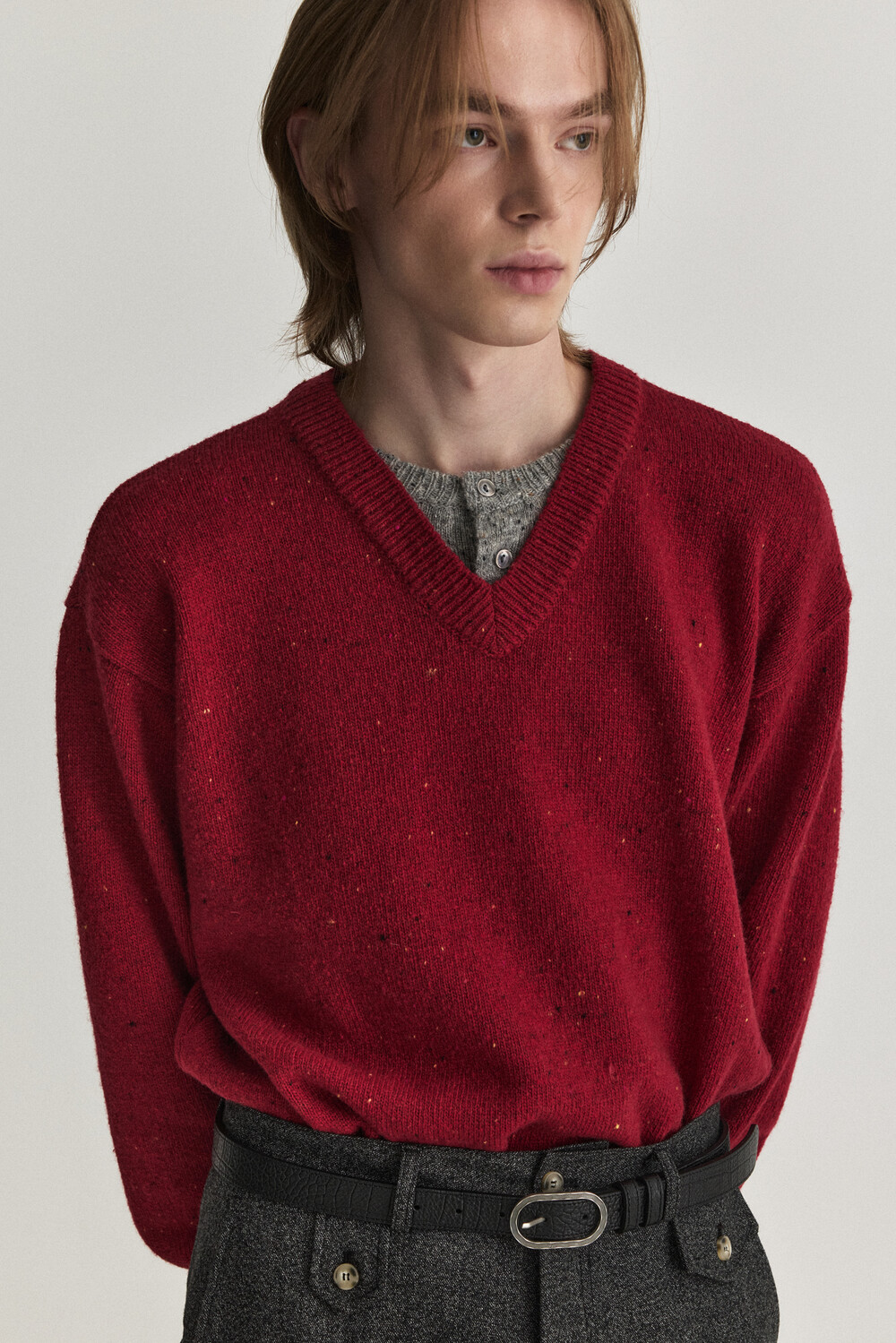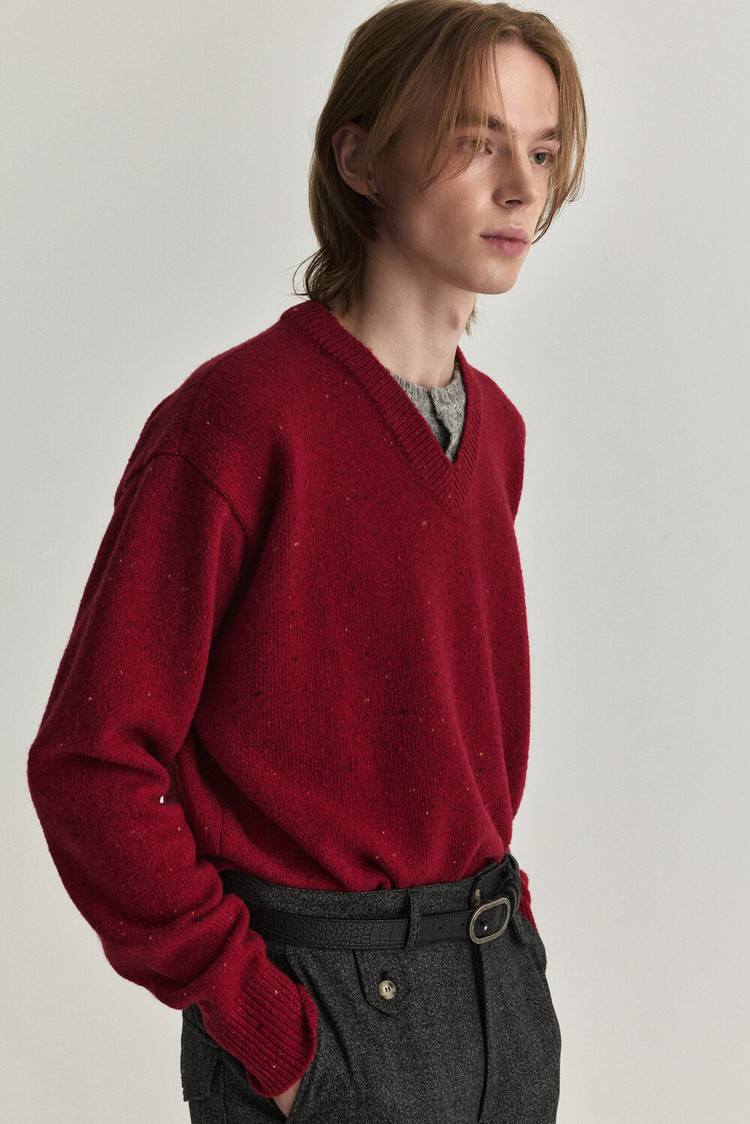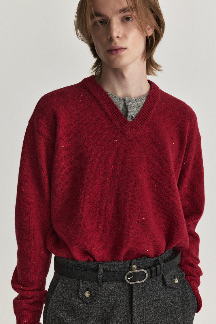 - 울 혼용 니트 패브릭으로 제작된 헨리넥 레이어드 브이넥 디자인