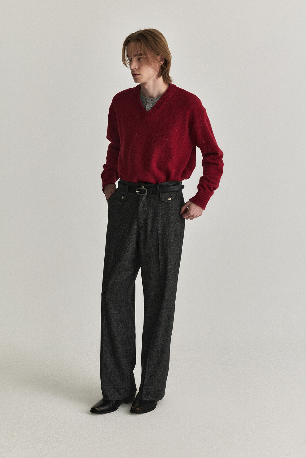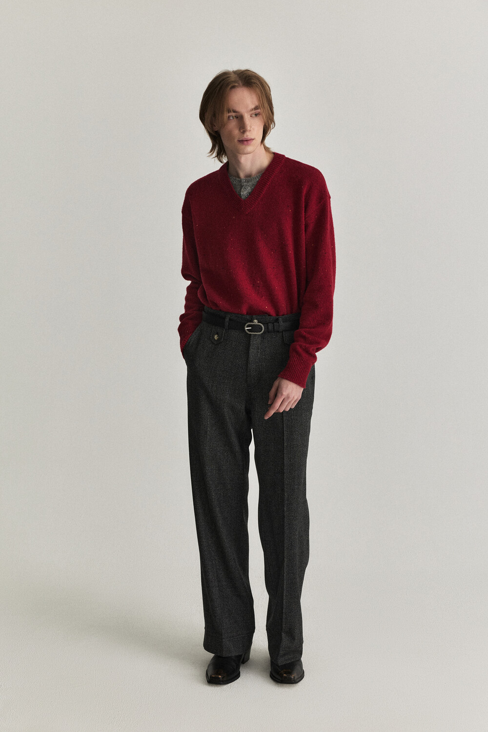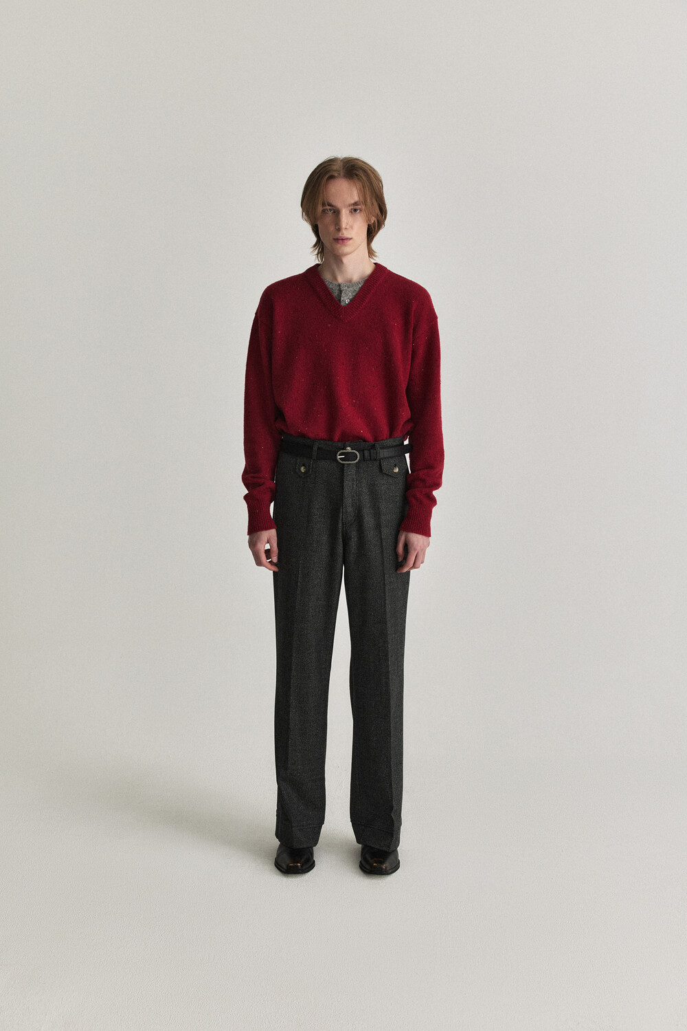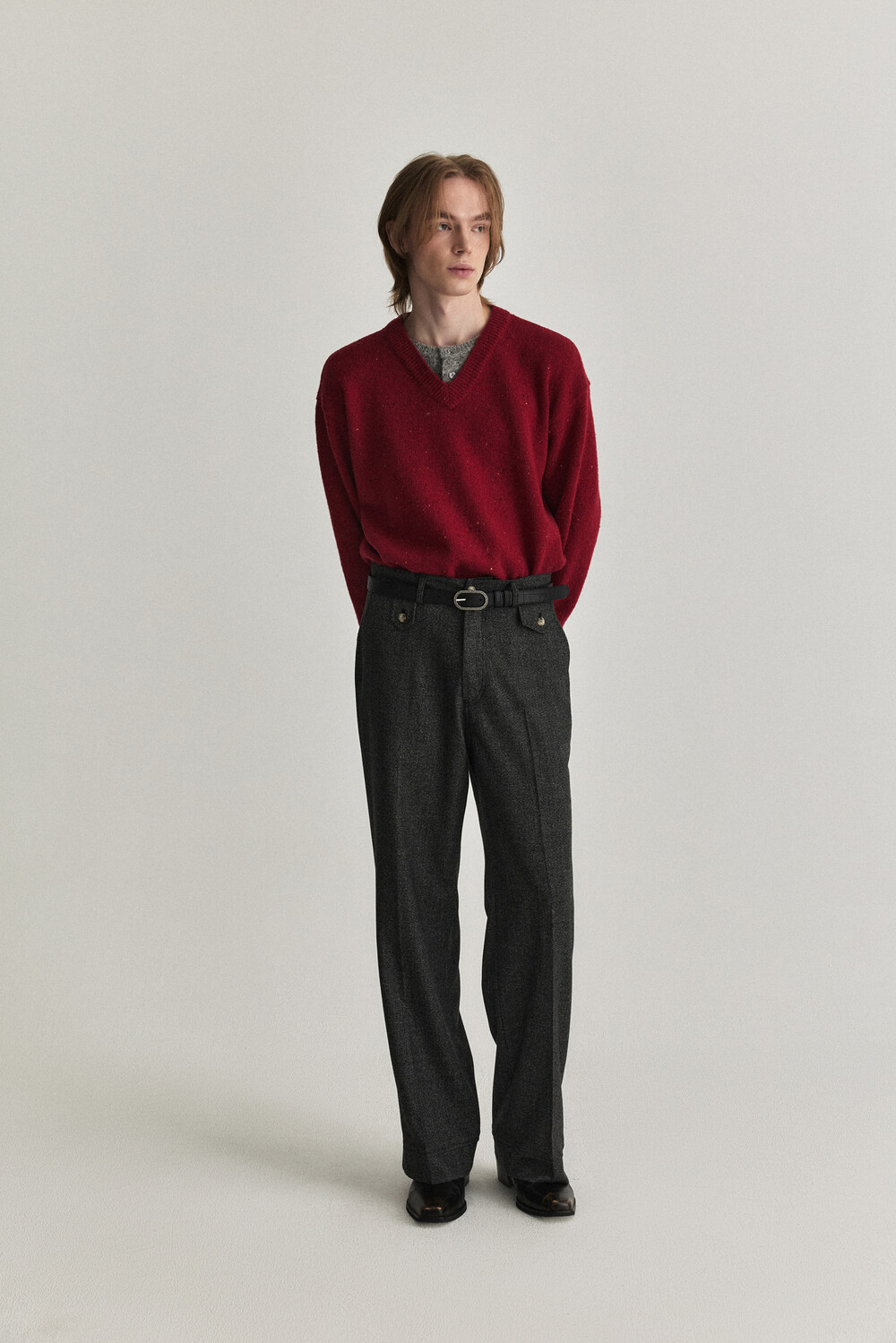 - 울 혼용 니트 패브릭으로 제작된 헨리넥 레이어드 브이넥 디자인