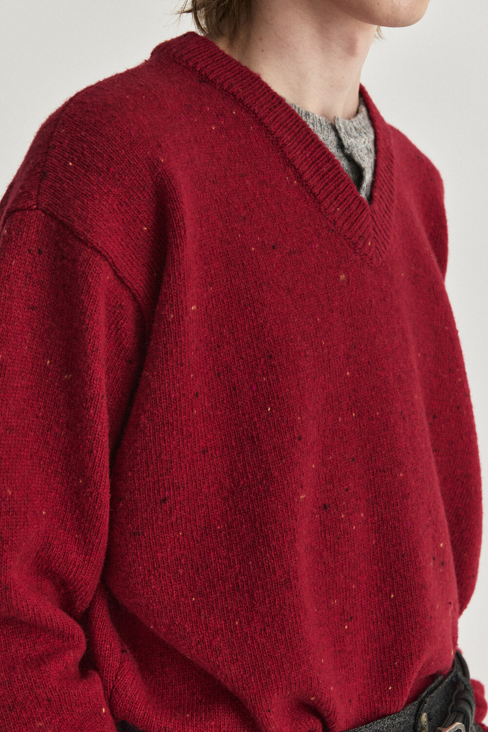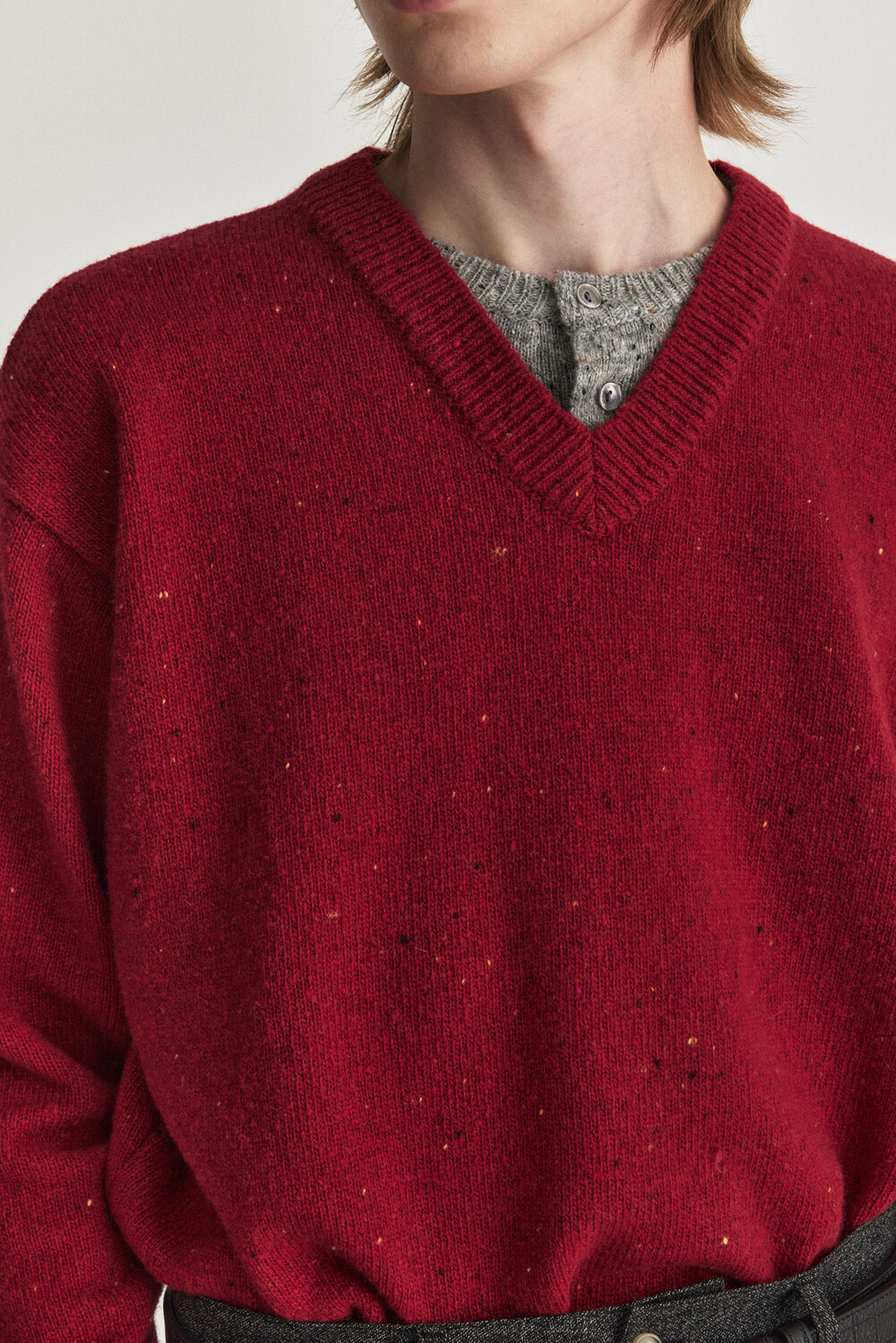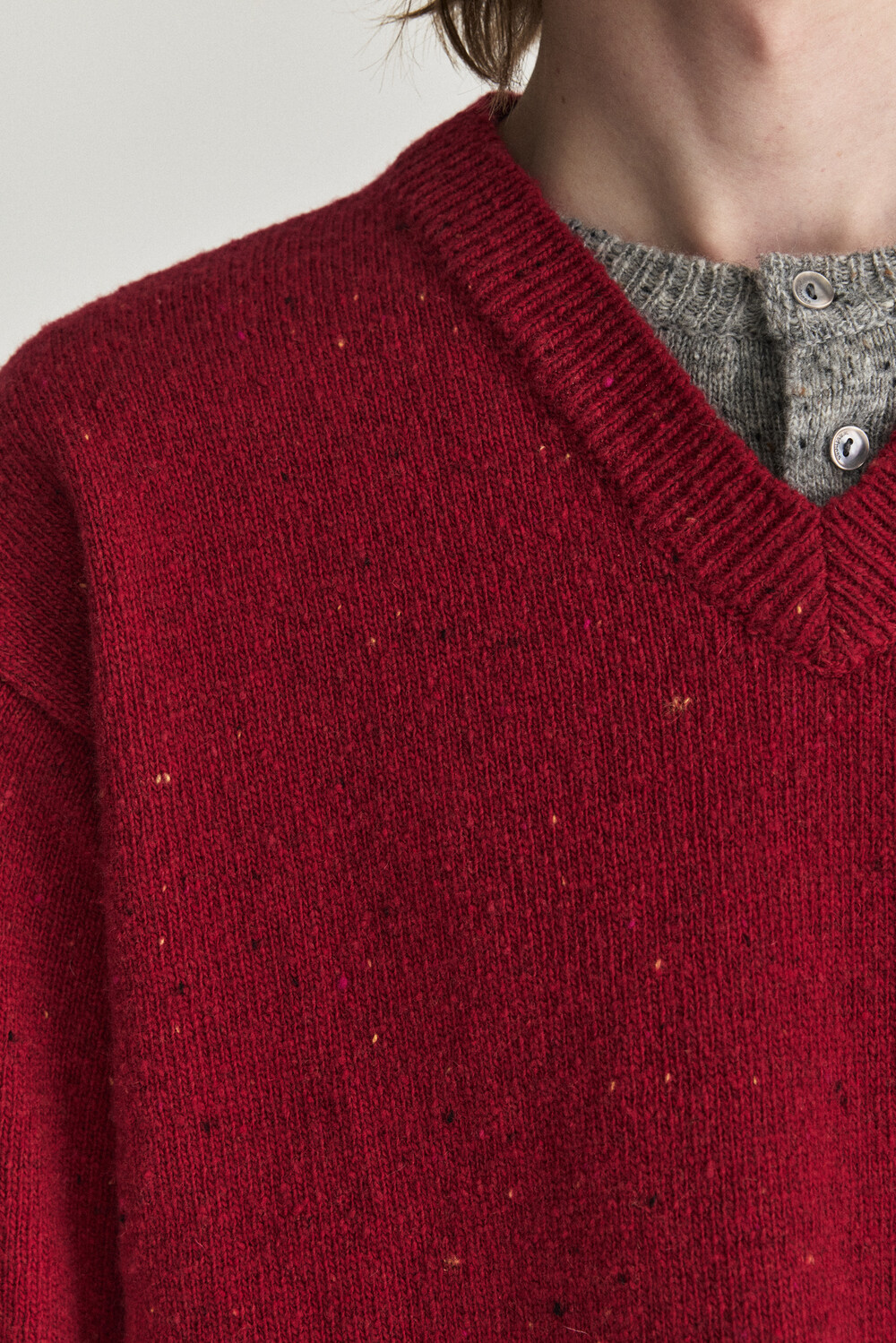 Henley Over V-neck Knit - Red Grey