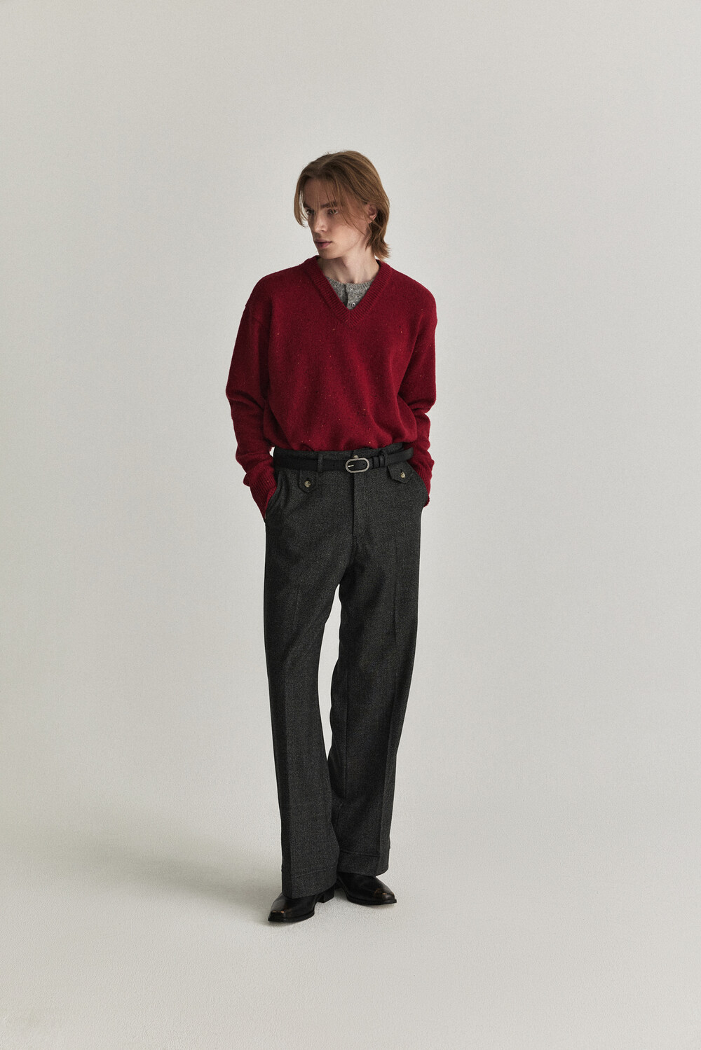 - 헨리넥과 브이넥을 레이어드해 입은 디자인